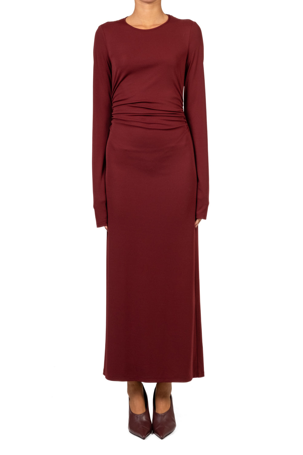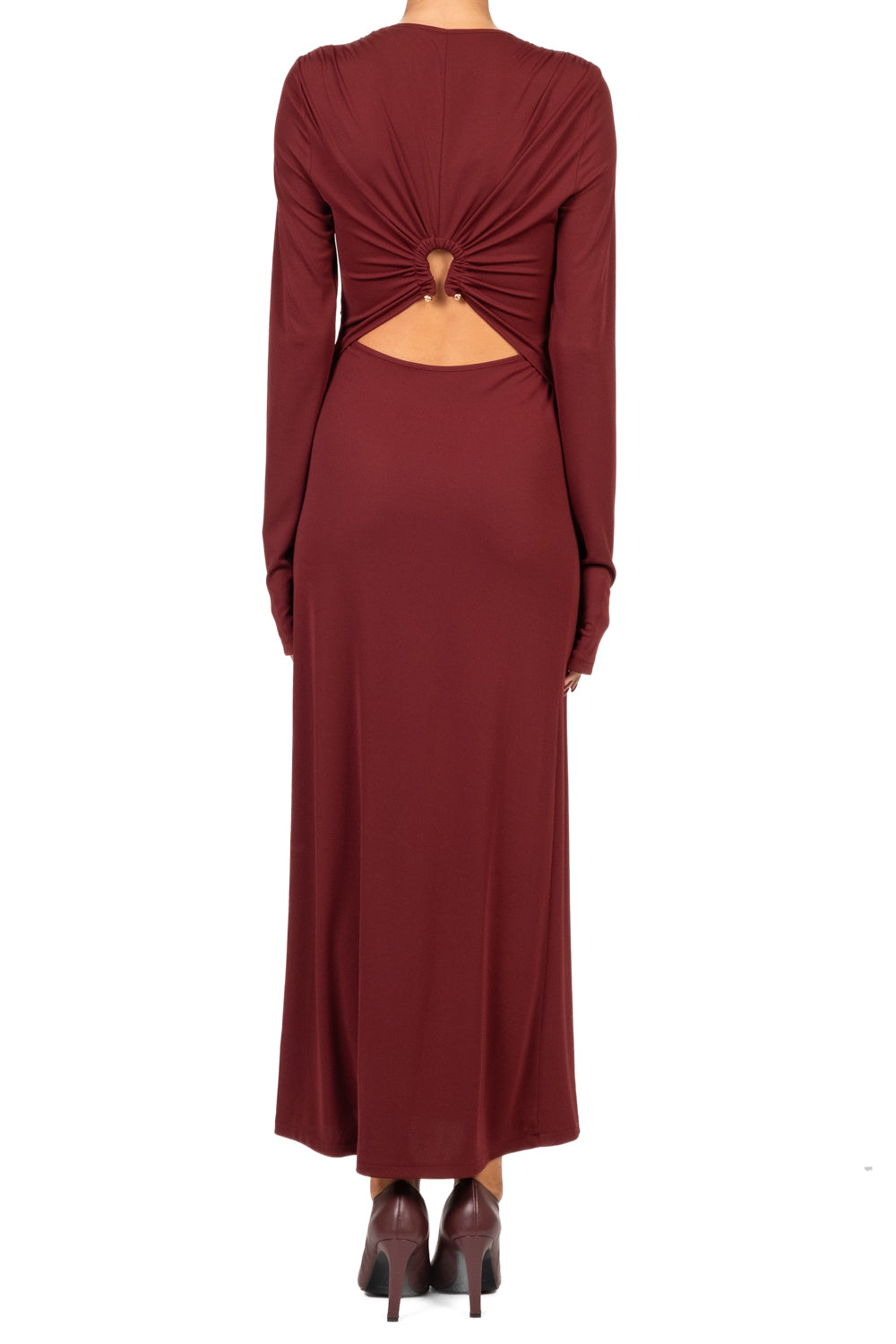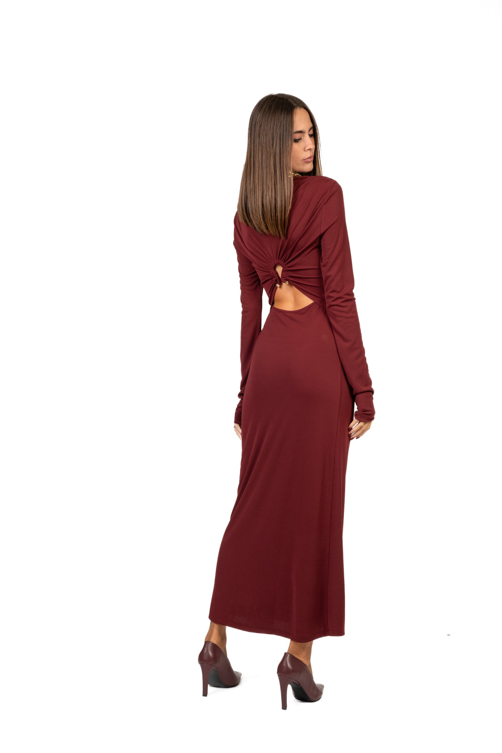 Leggero, sensuale e raffinato: questo abito in jersey fluido valorizza la figura con eleganza. Le arricciature laterali definiscono il punto vita, mentre lo scollo posteriore con dettaglio ad anello dona un tocco inaspettato e femminile. Un capo pensato per occasioni speciali, perfetto per chi cerca un look sofisticato ma contemporaneo.