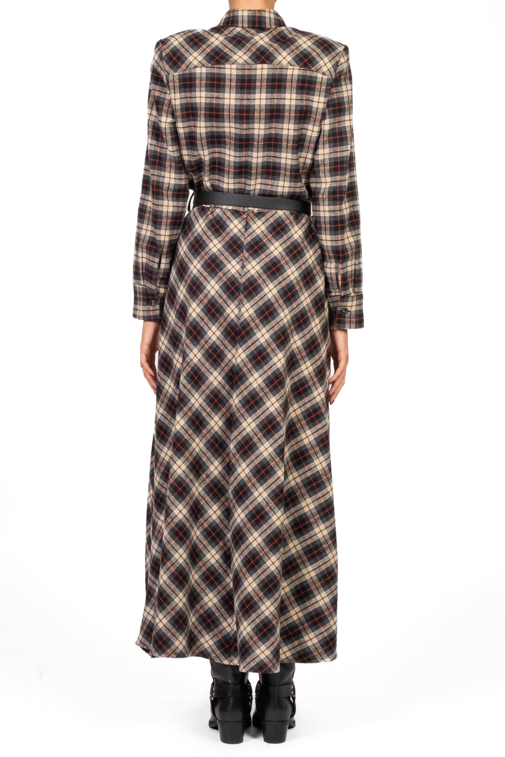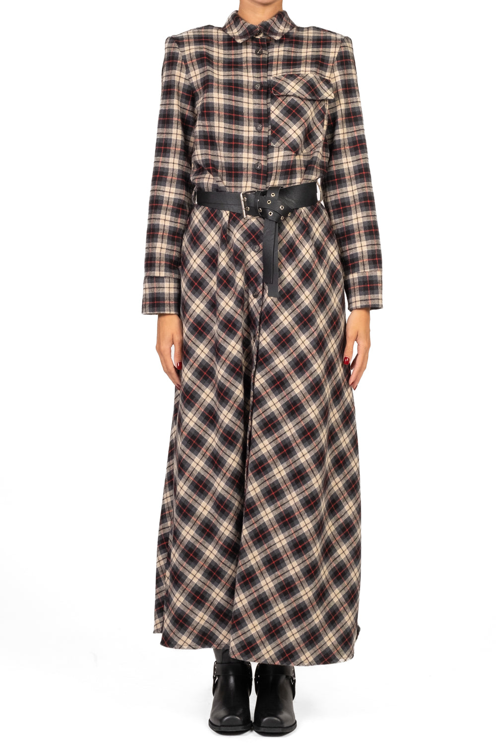 Abito chemisier in morbida flanella a fantasia check, valorizzato da cintura in vita che sottolinea la silhouette. Dotato di taschino frontale, pratiche tasche laterali e spalline imbottite per un tocco di struttura e stile. Unisce funzionalità e raffinatezza per un look moderno e confortevole.