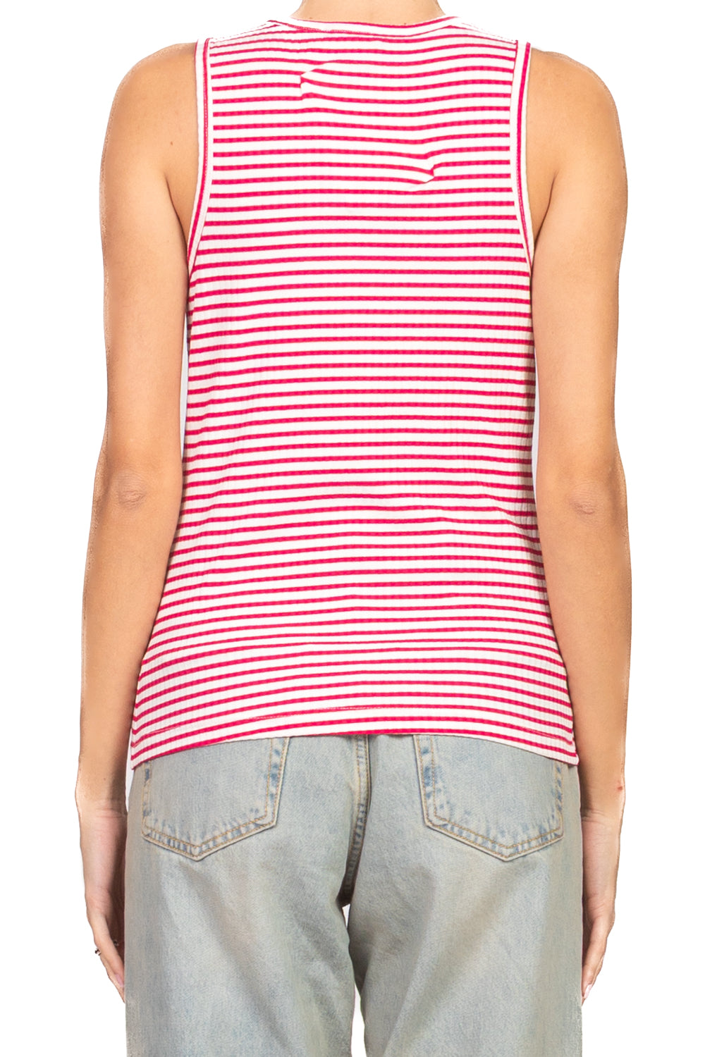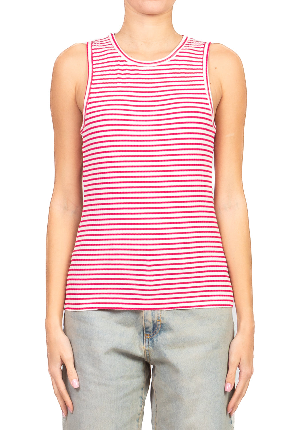 Canotta leggera a righe, con scollo a vogatore che valorizza spalle e collo. Perfetta per look casual estivi o da abbinare a top e giacche leggere per outfit moderni.