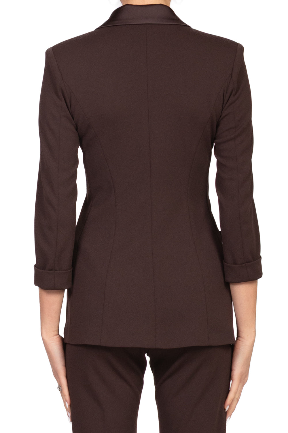 La giacca doppiopetto, dal fit asciutto e femminile, è impreziosita da profili in raso che ne esaltano le linee pulite. Le maniche a 3/4 aggiungono un tocco contemporaneo e versatile.