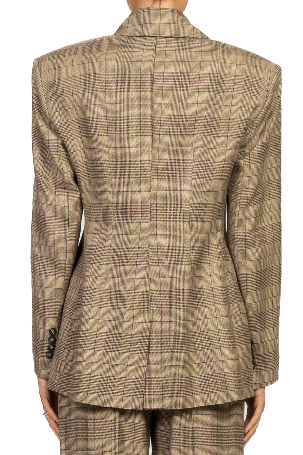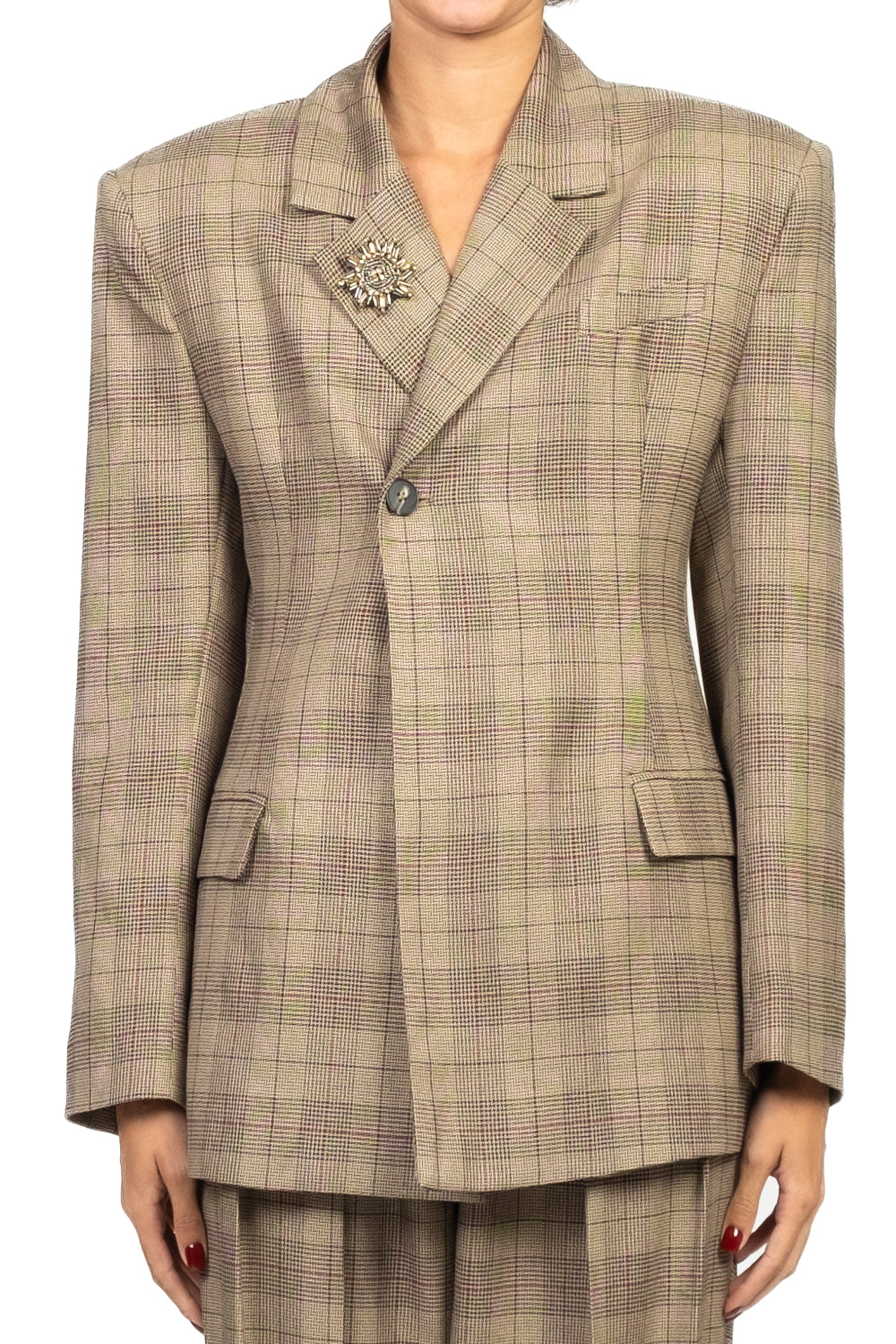 • Un capo statement che unisce stile sartoriale e dettagli inaspettati. Questa giacca over in tessuto Principe di Galles è caratterizzata da una chiusura con bottone asimmetrico posizionato in alto a destra, per un effetto moderno e originale. La spilla gioiello applicata sul bavero aggiunge un tocco luminoso e sofisticato, mentre lo spacco posteriore sul rever e la fodera interna completano il capo con cura sartoriale. Perfetta per distinguersi con eleganza.