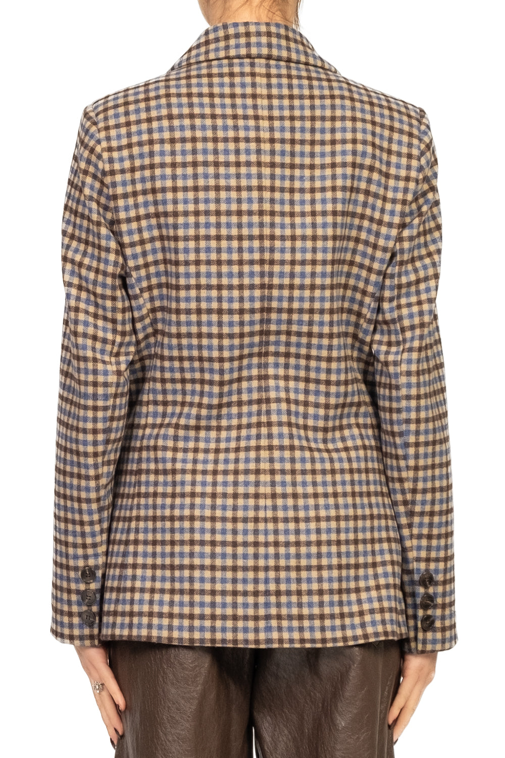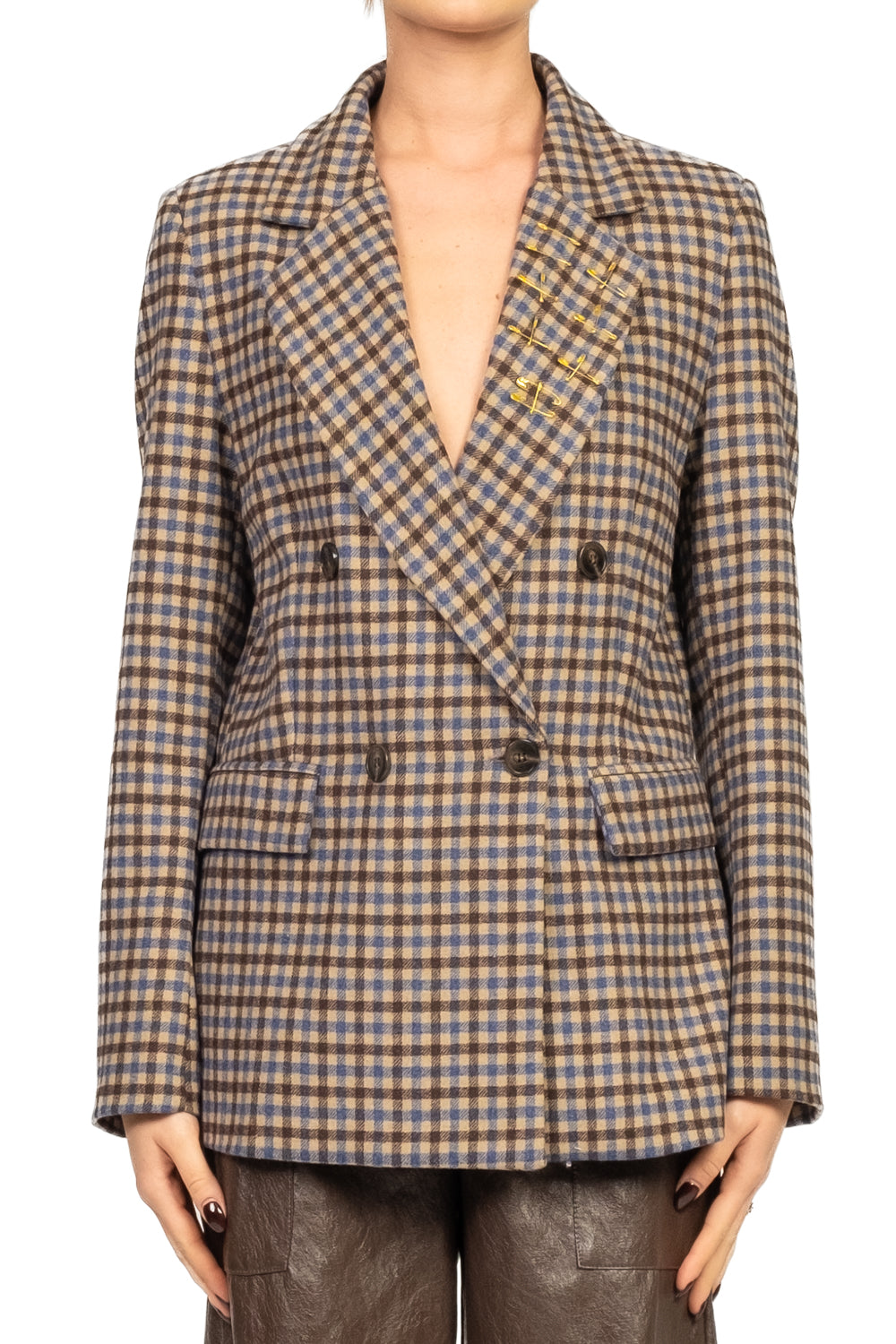 Un capo sofisticato e di carattere, questa giacca over doppio petto presenta un raffinato motivo a quadretti, arricchito da spille decorative sul bavero per un tocco distintivo. Completamente foderata all’interno, garantisce comfort e vestibilità ottimale. Le spalline leggermente imbottite donano struttura e definizione alla silhouette, rendendola perfetta per look eleganti e contemporanei.