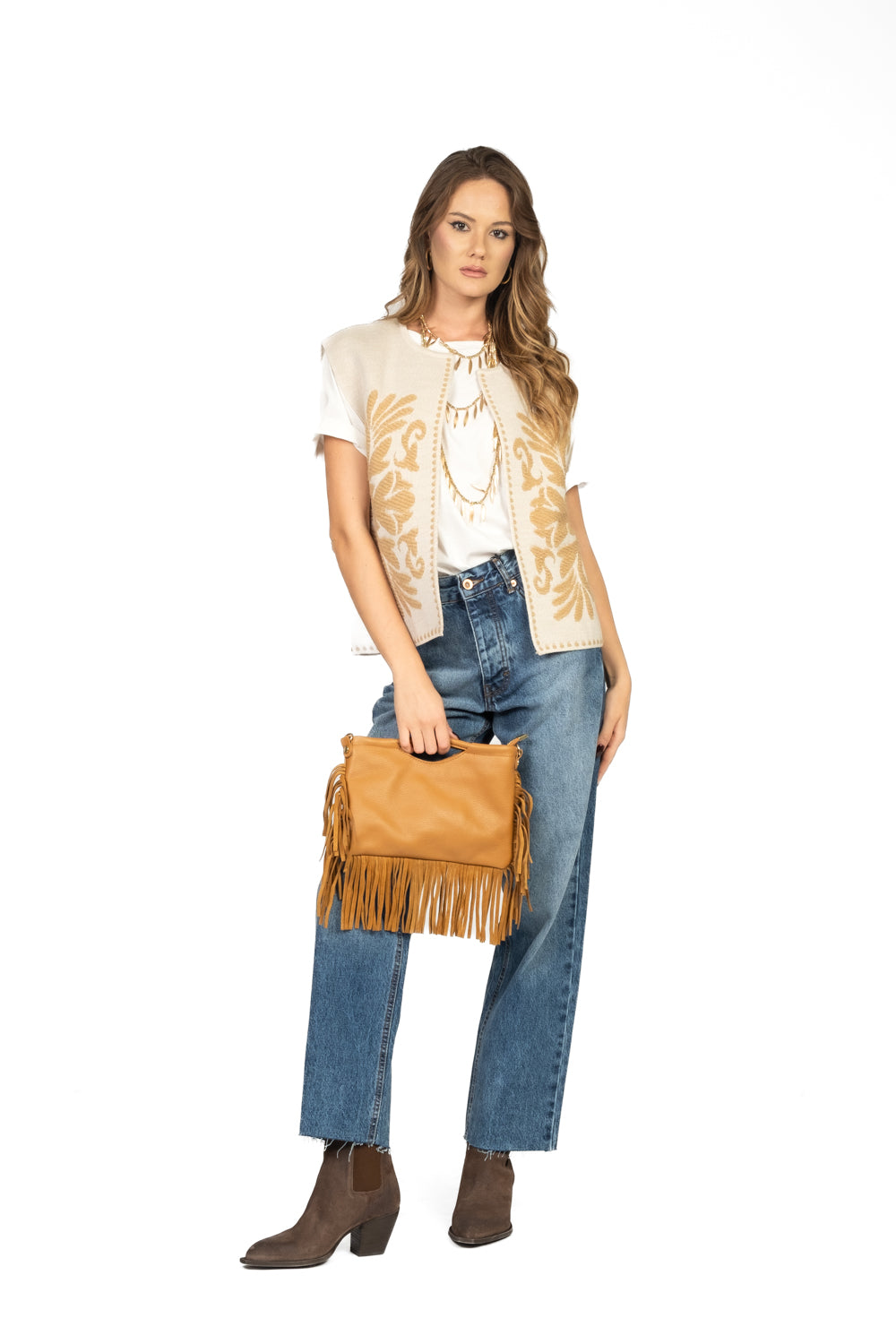 Un capo versatile e raffinato, perfetto per arricchire i tuoi outfit con un tocco di originalità. Questo gilet in maglia, aperto sul davanti, è impreziosito da delicati ricami che ne esaltano la texture e il design. Ideale da indossare sopra camicie, top o abiti leggeri, è la soluzione perfetta per aggiungere un livello di stile senza rinunciare al comfort.