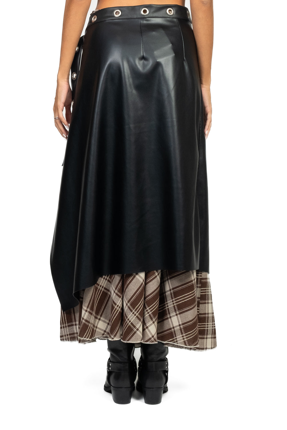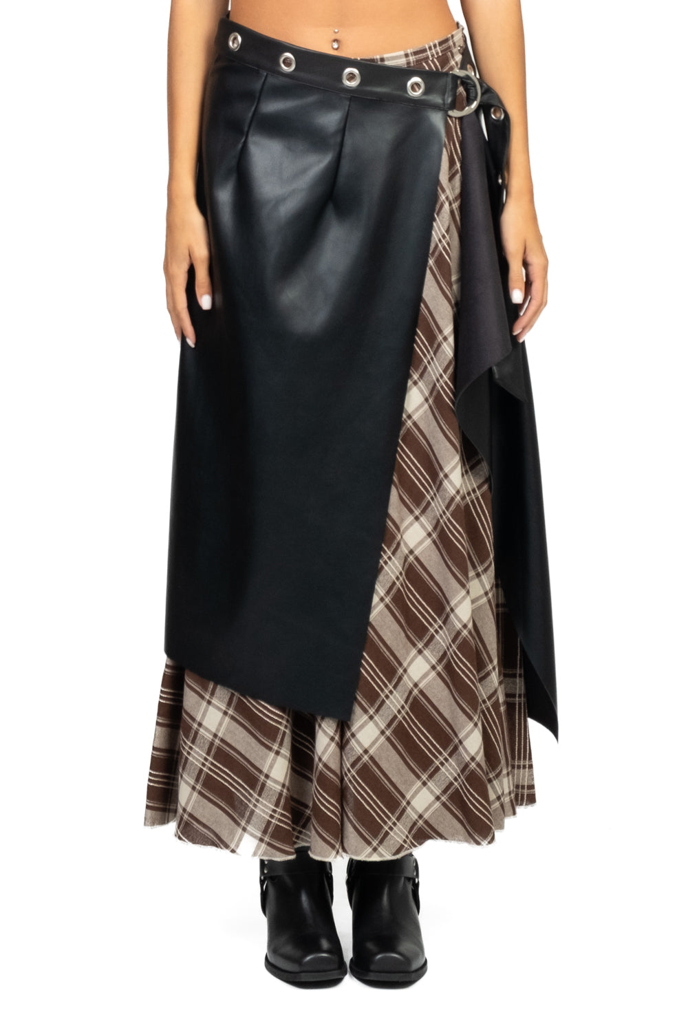 • Gonna lunga con sovrapposizione in ecopelle separata, per un look moderno e versatile. La gonna check presenta una chiusura lampo laterale, mentre il doppio strato in ecopelle si chiude in modo asimmetrico con cintura integrata. Perfetta per un outfit d’impatto e di carattere.