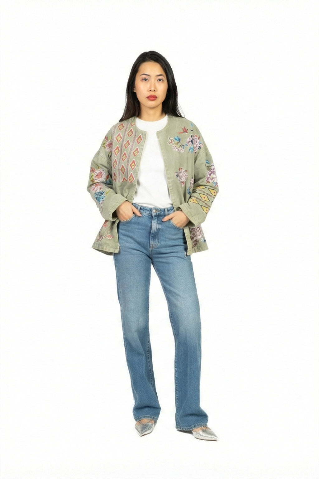 Giacca in denim verde slavato dal carattere deciso e contemporaneo, impreziosita da ricami colorati ispirati a delicati disegni orientali che ne esaltano l’unicità. La linea essenziale, senza tasche, valorizza la silhouette e mette in risalto i dettagli decorativi. La chiusura con bottoni automatici aggiunge praticità e un tocco moderno, rendendola perfetta per completare con stile sia look casual che più ricercati.