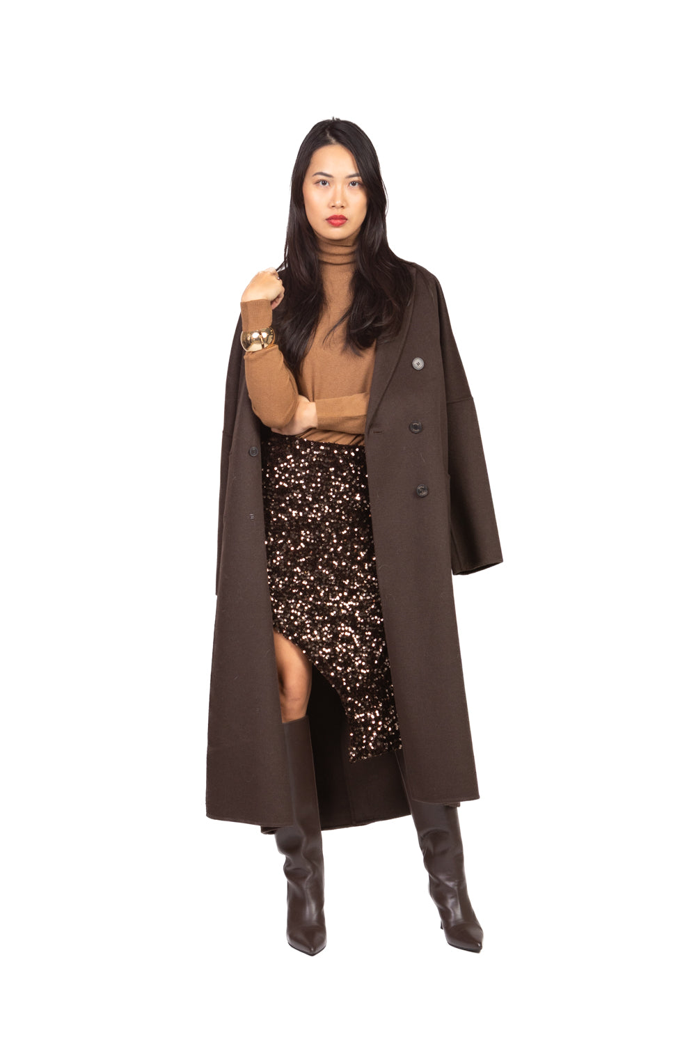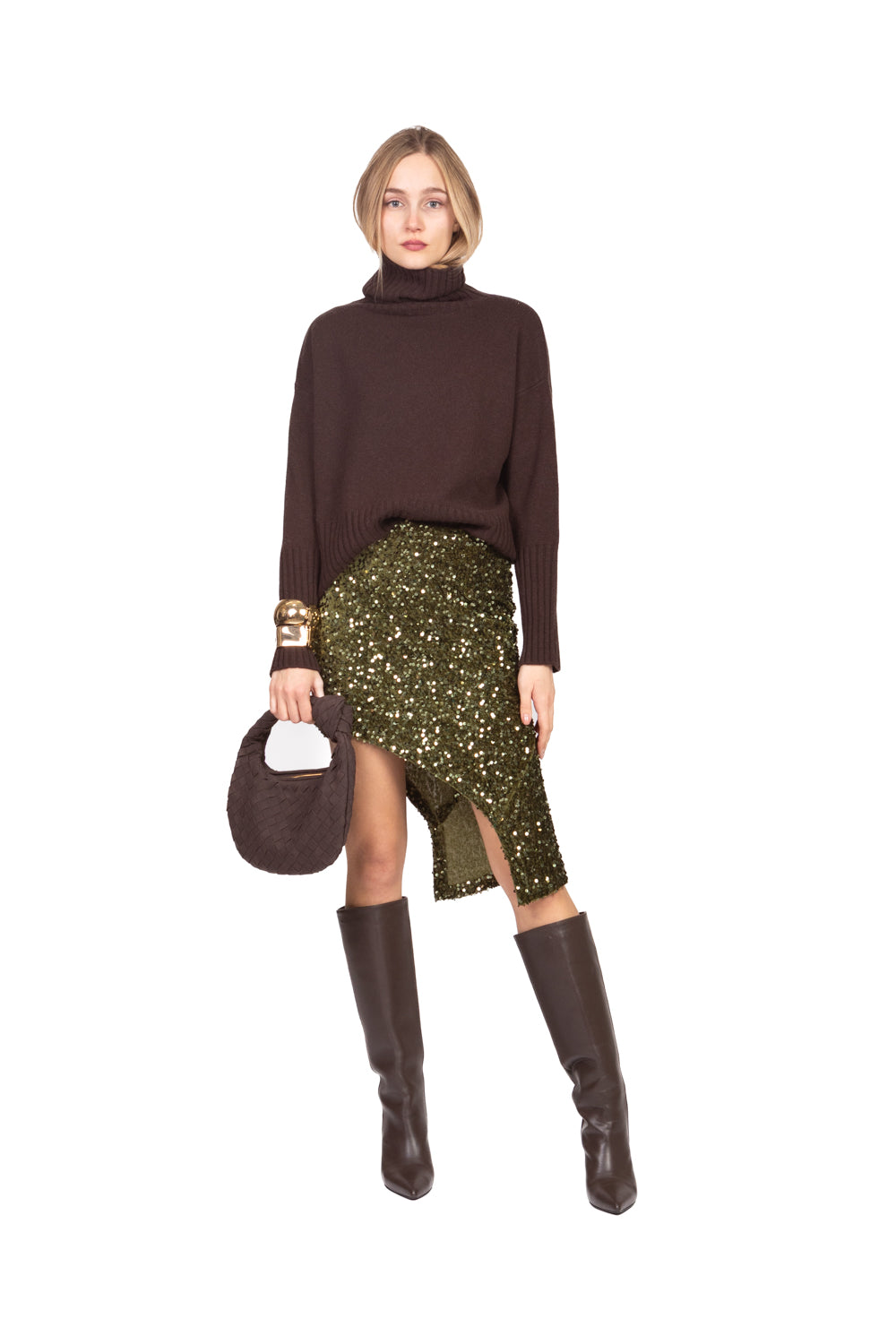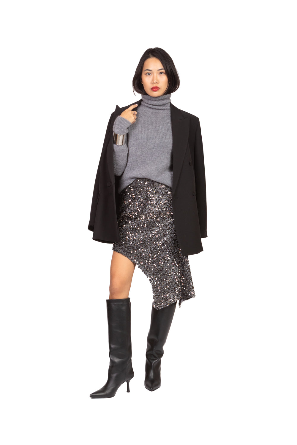 Gonna mini asimmetrica in ciniglia con paillettes, vita elasticizzata per comfort e vestibilità ottimale. Linea fluida e scintillante, perfetta per outfit eleganti e di impatto.