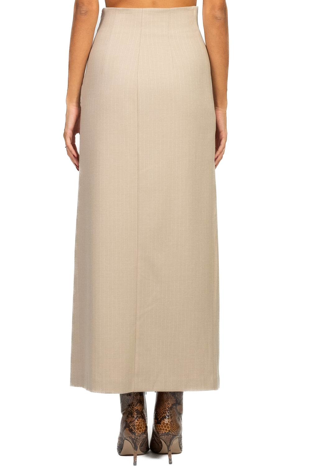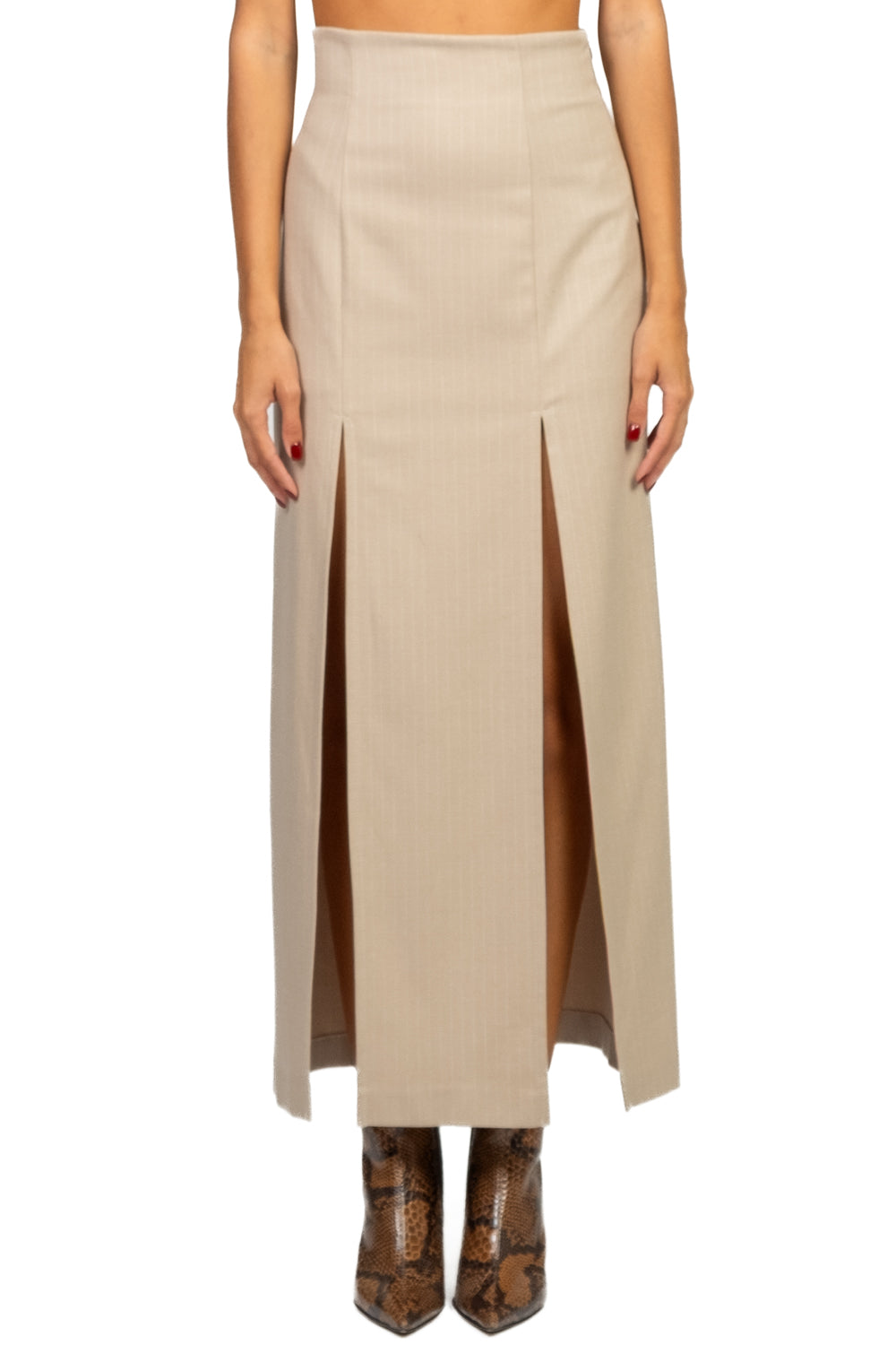 Gonna lunga in tessuto gessato, dal design elegante con due spacchi frontali che donano movimento e femminilità. Chiusura con zip laterale invisibile per una linea pulita e sofisticata. Perfetta da abbinare a camicie, blazer o maglie per un look deciso e contemporaneo.