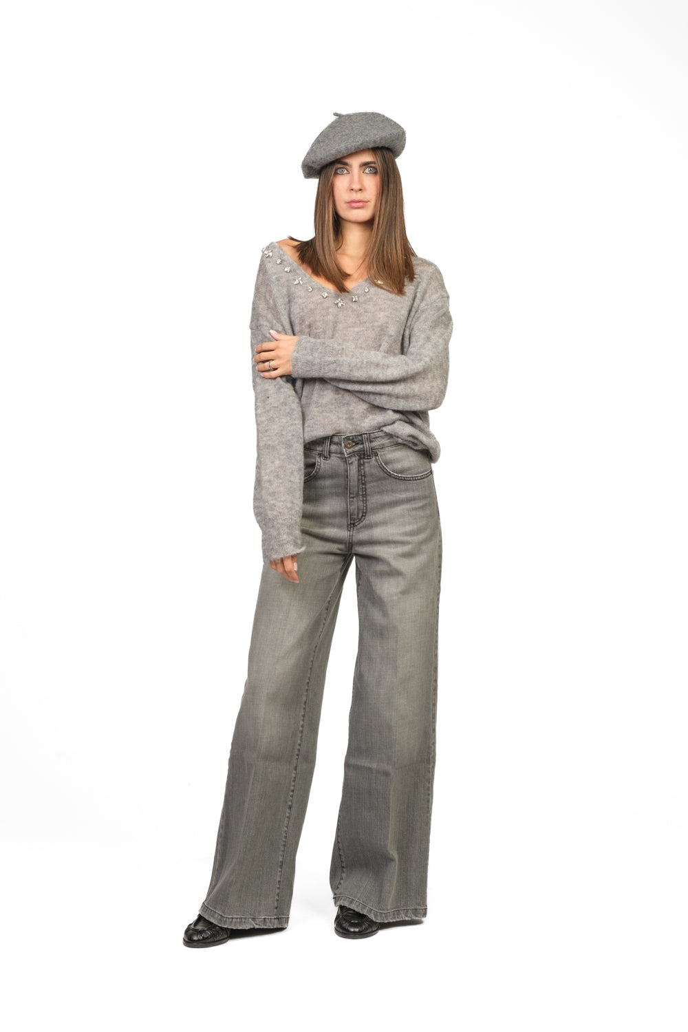 • Maglia in misto lana con scollo a V, decorata con applicazioni gioiello lungo lo scollo. Fit morbido e confortevole, perfetta per un look elegante e raffinato.