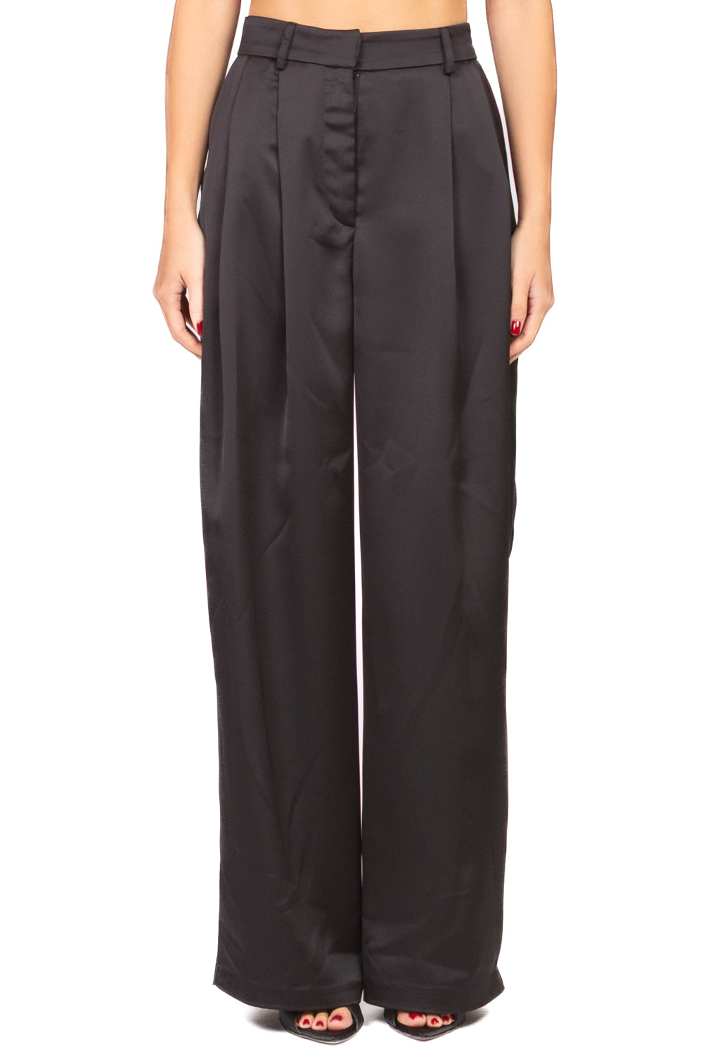 Pantalone palazzo realizzato in satin, caratterizzato da pinces frontali, chiusura frontale con lampo, gancetto e bottone nascosto, e tasche a filo. Linee eleganti e fluide, perfetto per look raffinati e contemporanei.