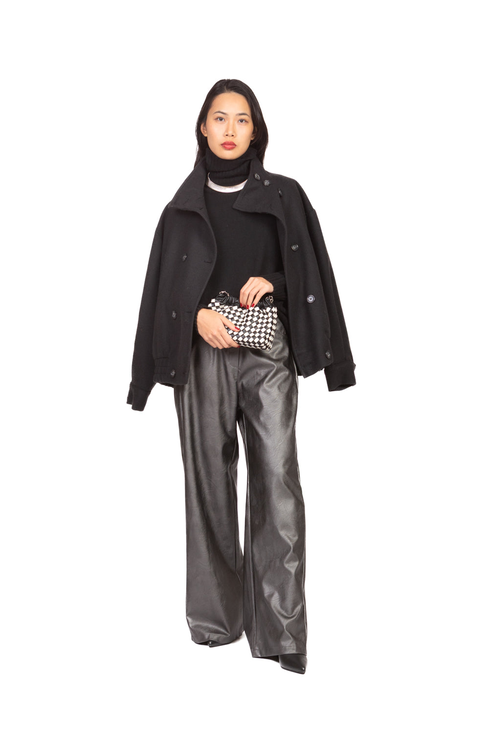 Pantalone palazzo realizzato in ecopelle laminata, caratterizzato da 5 tasche e tasconi posteriori. Chiusura frontale con lampo e bottone. Linee ampie e moderne, ideale per look contemporanei e di impatto.