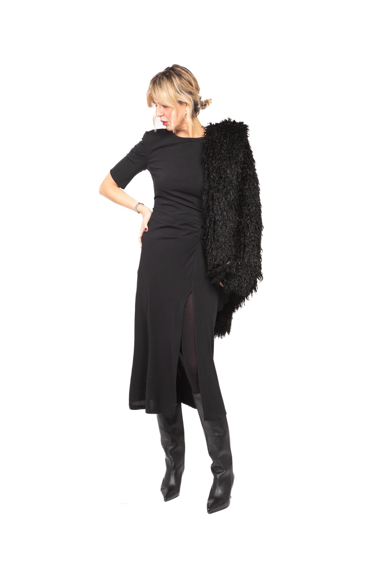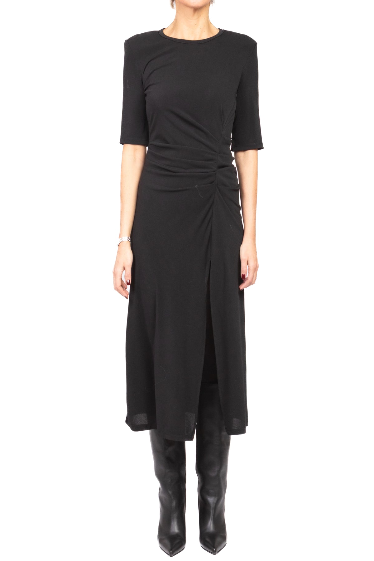 Abito girocollo a mezza manica in tessuto leggero ed elasticizzato, con arricciatura laterale e spacco frontale laterale per una silhouette slanciata. Dotato di spalline leggermente imbottite per una linea definita. Stile elegante e confortevole.