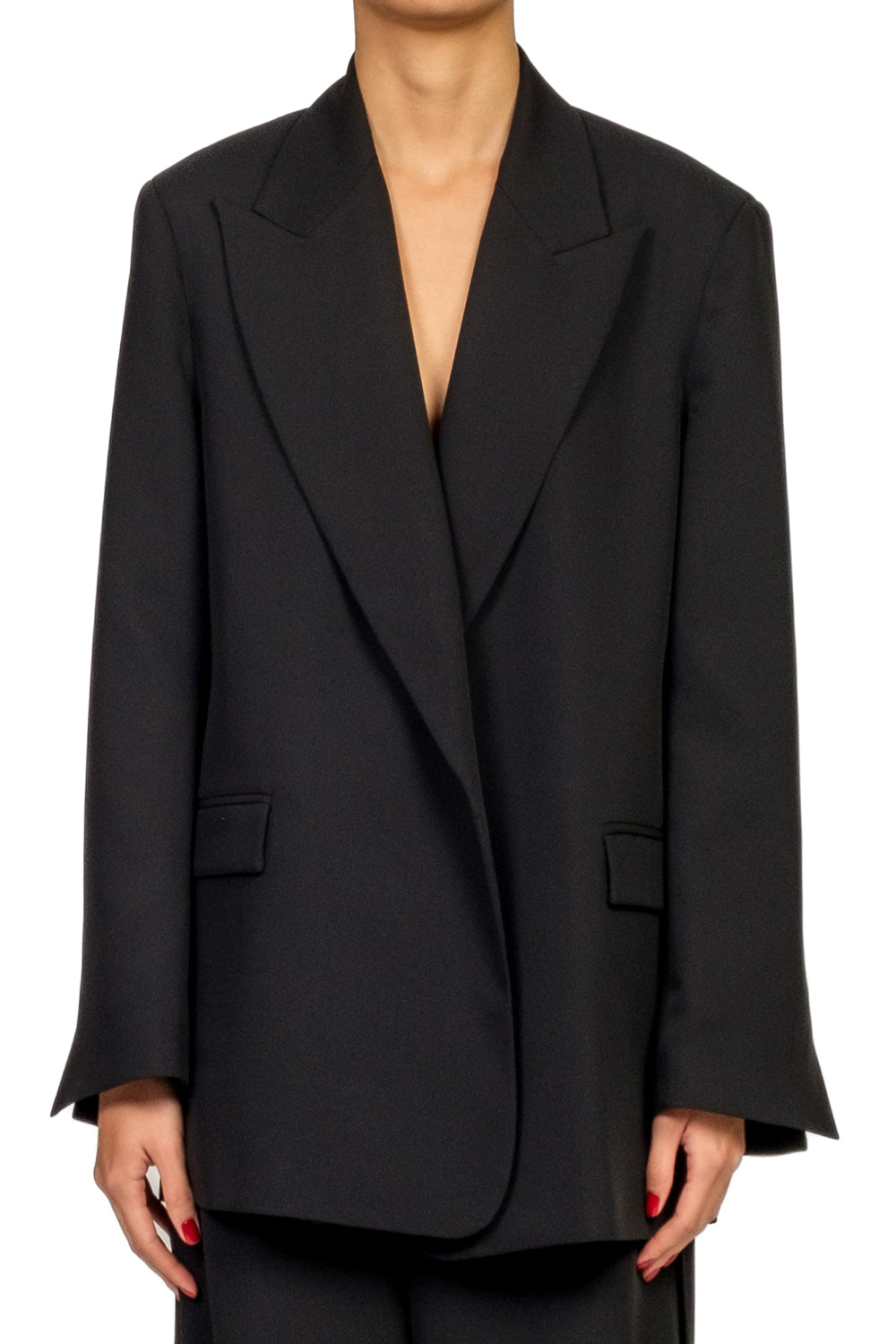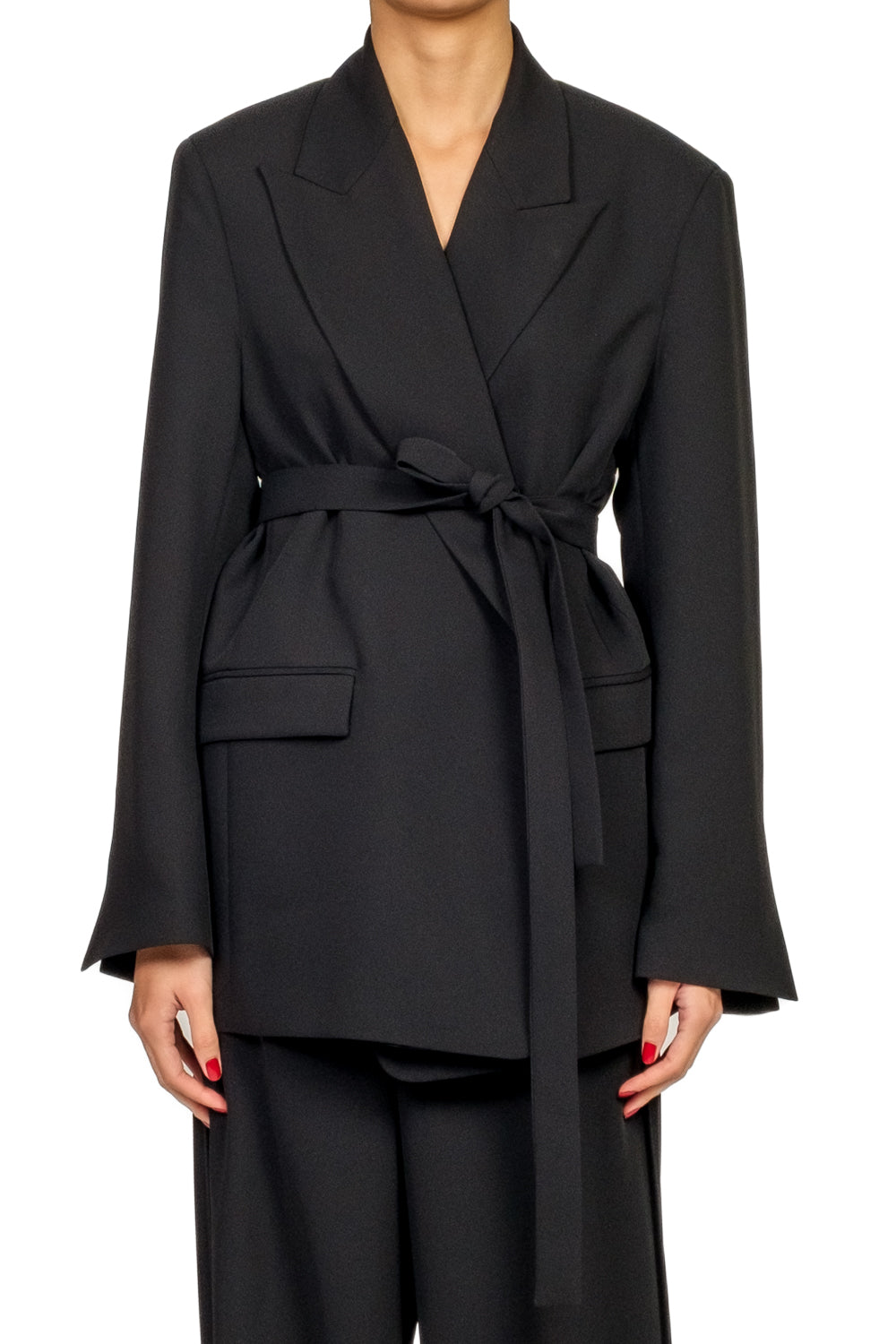 Giacca realizzata in crepe, caratterizzata da spalline imbottite che definiscono la struttura e da una vestibilità leggermente over. Modello senza chiusura, completato da fusciacca abbinata per regolare il punto vita. Interamente foderata per un maggiore comfort e una migliore vestibilità. Ideale per look eleganti e contemporanei.