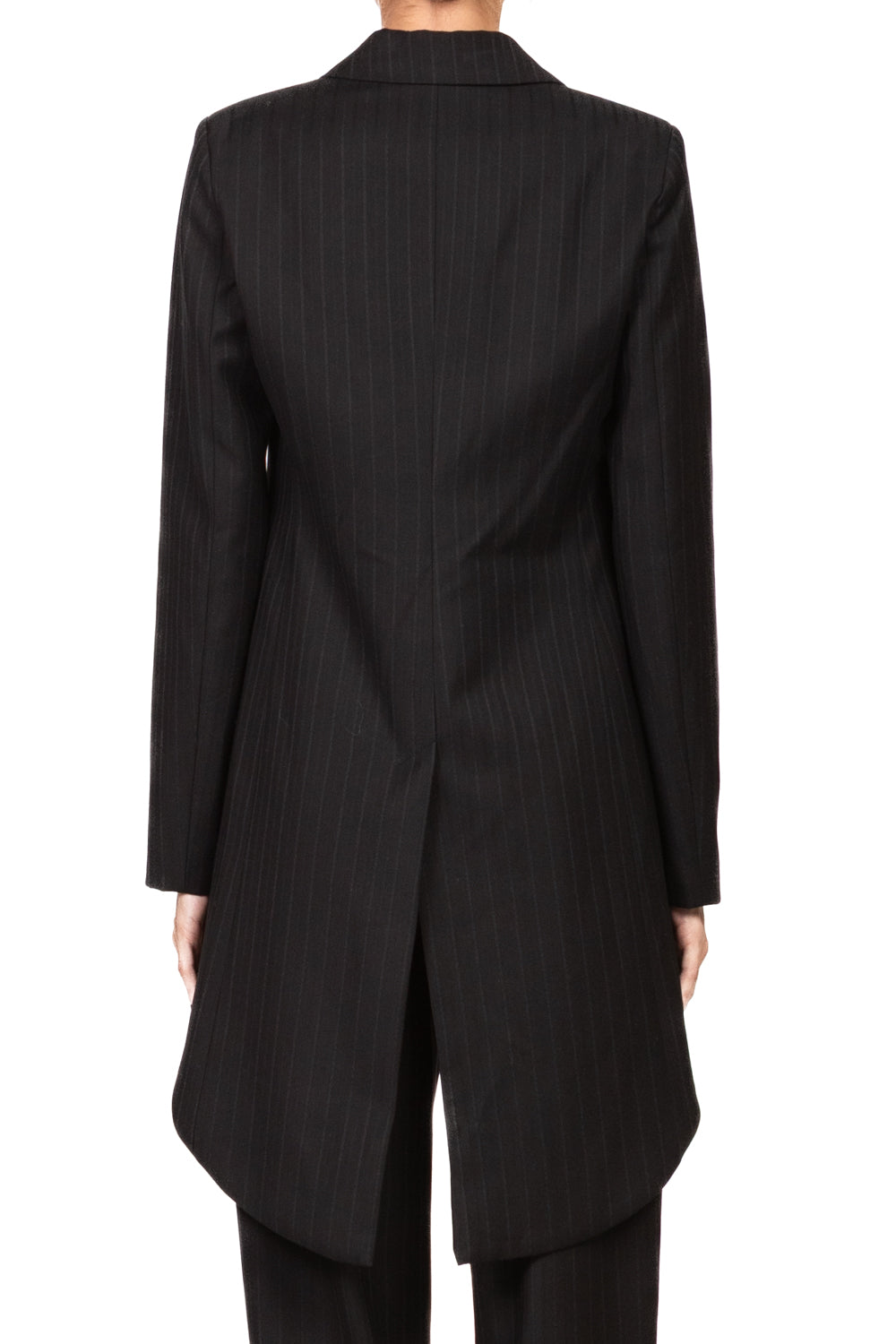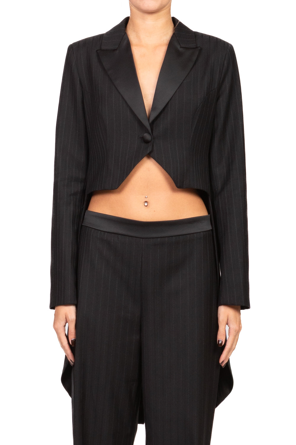 • Giacca frac in tessuto gessato, con bavero e bottone rivestiti in raso per un dettaglio elegante. Dotata di spalline imbottite per struttura e spacco posteriore per libertà di movimento. Internamente foderata, combina comfort e stile formale contemporaneo.