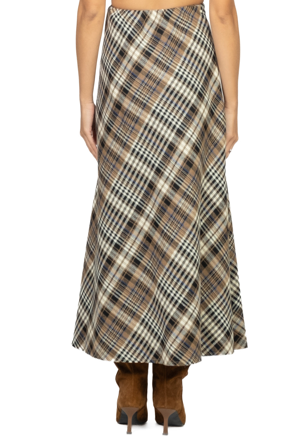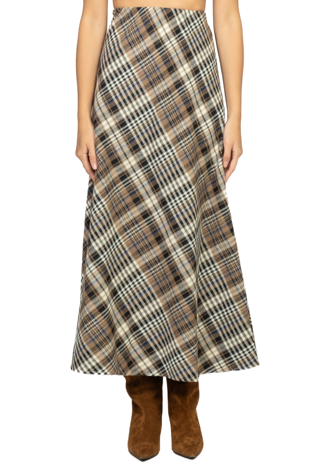 • Gonna svasata in tessuto check misto lana con elastico in vita. Senza tasche, linea morbida e femminile per un look caldo e contemporaneo.
