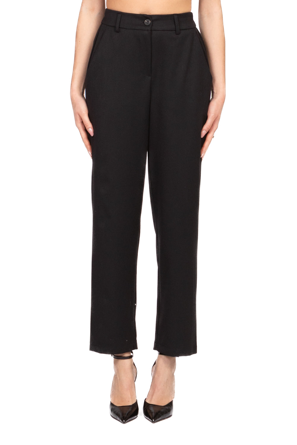 Pantalone carrot in flanella morbida, con vita elastica sul retro per comfort e vestibilità adattabile. Chiusura frontale con zip e bottone, completata da tasche a filo per un design pulito ed elegante. Linea moderna e versatile, perfetta per look formali e quotidiani.