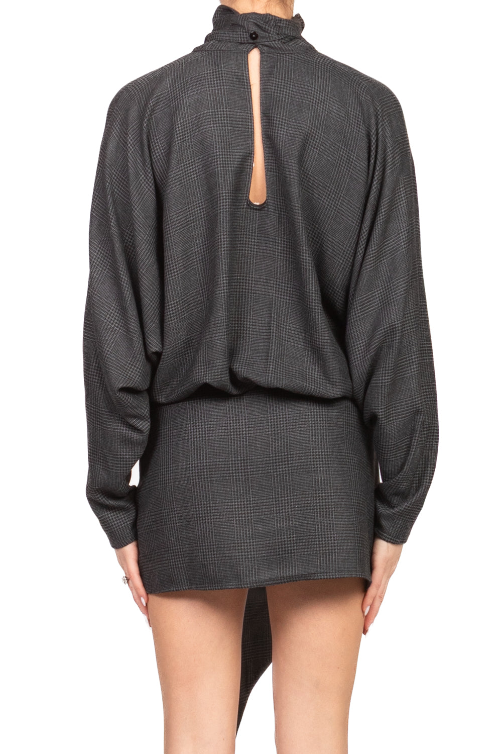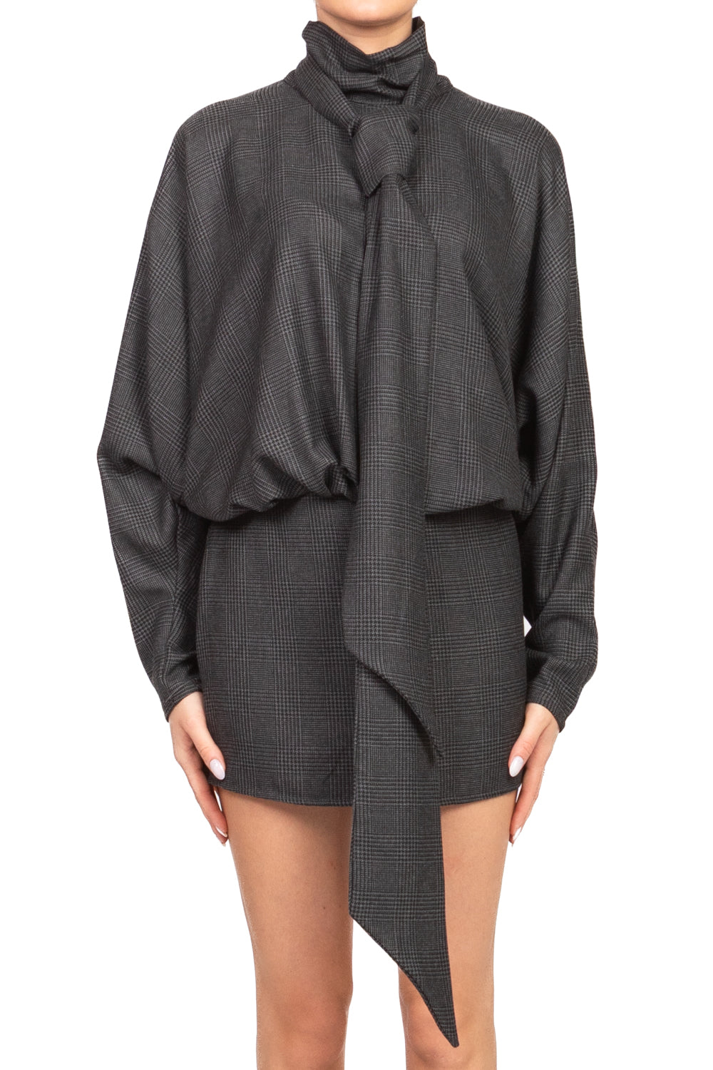 Femminile e sofisticato, questo abito corto in fantasia Principe di Galles presenta un top morbido con maniche ampie e un colletto che si annoda in un fiocco delicato. La chiusura posteriore con asola e bottoncino aggiunge un tocco raffinato, mentre la parte della gonna dal taglio asciutto bilancia perfettamente i volumi del capo. Un abito ideale per occasioni speciali o look da giorno ricercati.
