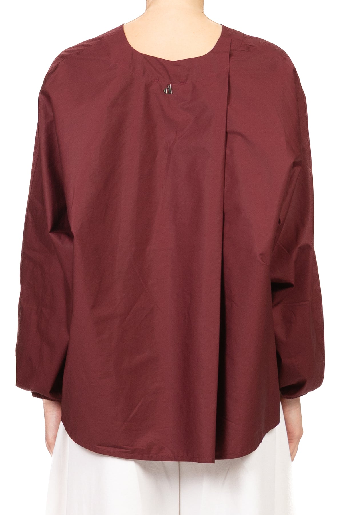 Blusa dal taglio oversize con scollo a V e maniche ampie a pipistrello, arricchita da taschini frontali e chiusura con bottoni nascosti. Polsini elasticizzati e lunghezza leggermente più lunga sul retro garantiscono comfort e stile, perfetta per look casual ma raffinati.