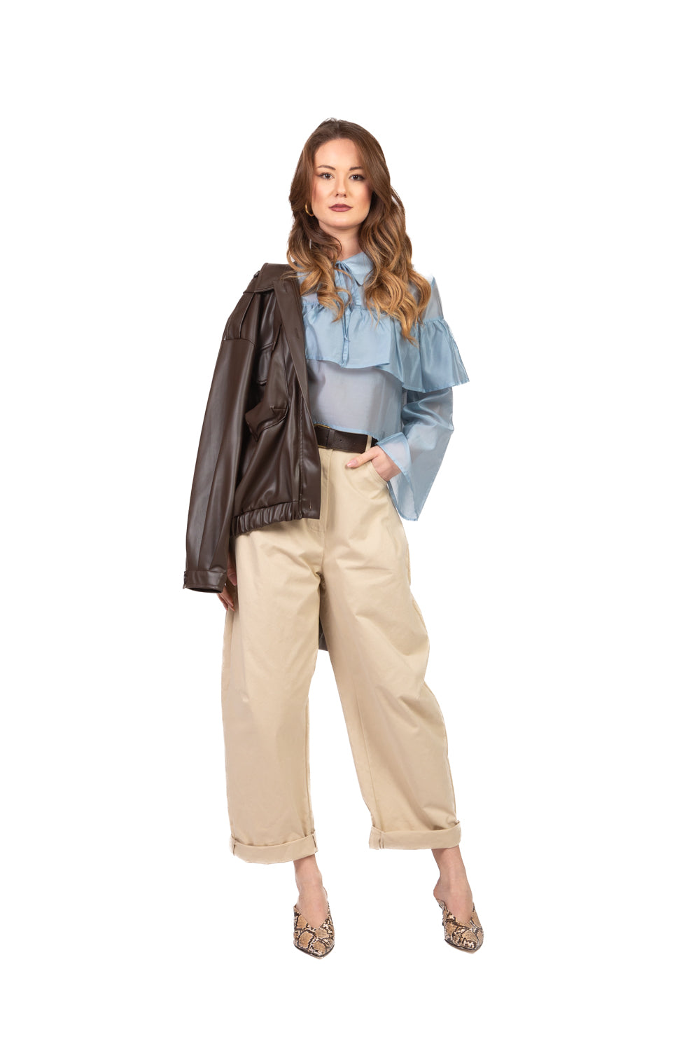 • Blusa crop dal design femminile e moderno. Modello a scatoletta con rouches decorative, colletto con laccio e scollo a goccia, maniche ampie per un effetto voluminoso e sofisticato. Perfetta per look contemporanei e chic.