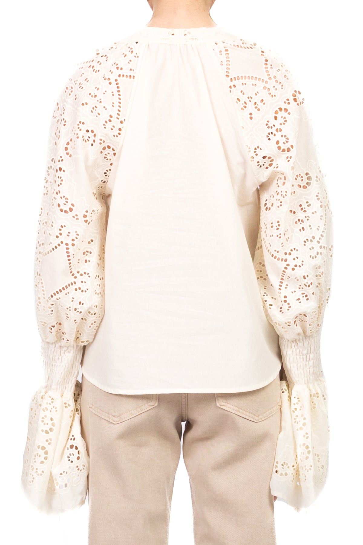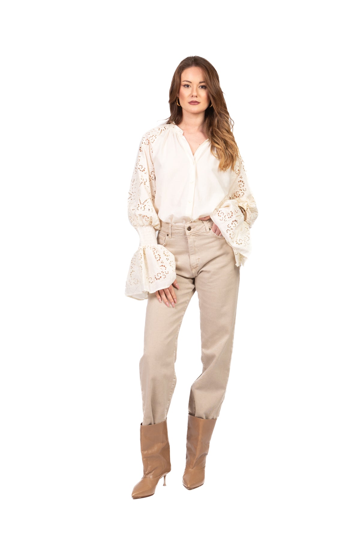 Camicia elegante con collo coreana, caratterizzata da maniche in pizzo San Gallo e polsini elasticizzati che creano un effetto ampio sul fondo. Un capo raffinato e femminile, ideale per look sofisticati e contemporanei.