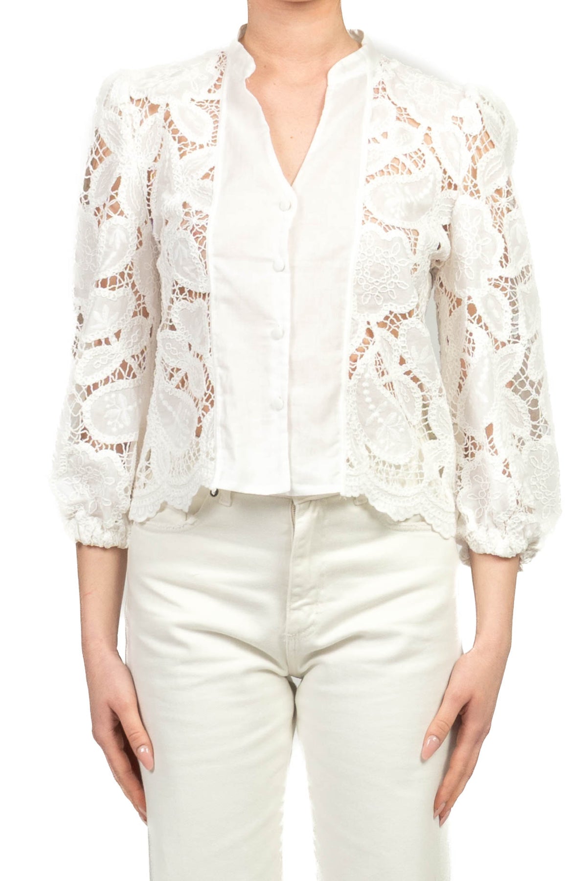 Camicia ricamata, leggermente corta e femminile, con maniche 3/4 a palloncino e collo coreana. Chiusura frontale con bottoni rivestiti per un look elegante e raffinato.