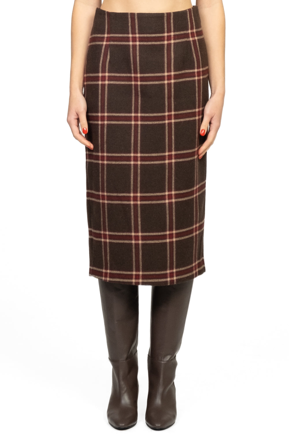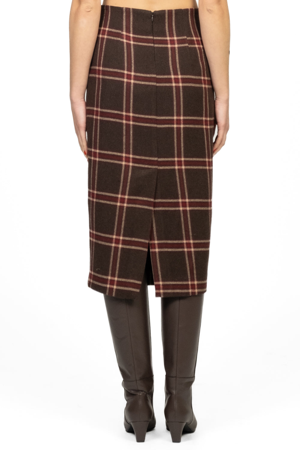 • Gonna longuette a quadri in misto lana con spacco posteriore e chiusura a zip sul retro. Linea aderente e raffinata, perfetta per look eleganti e professionali.