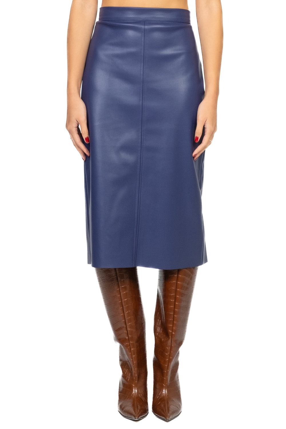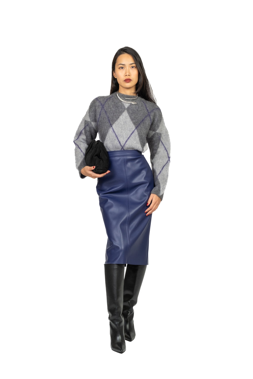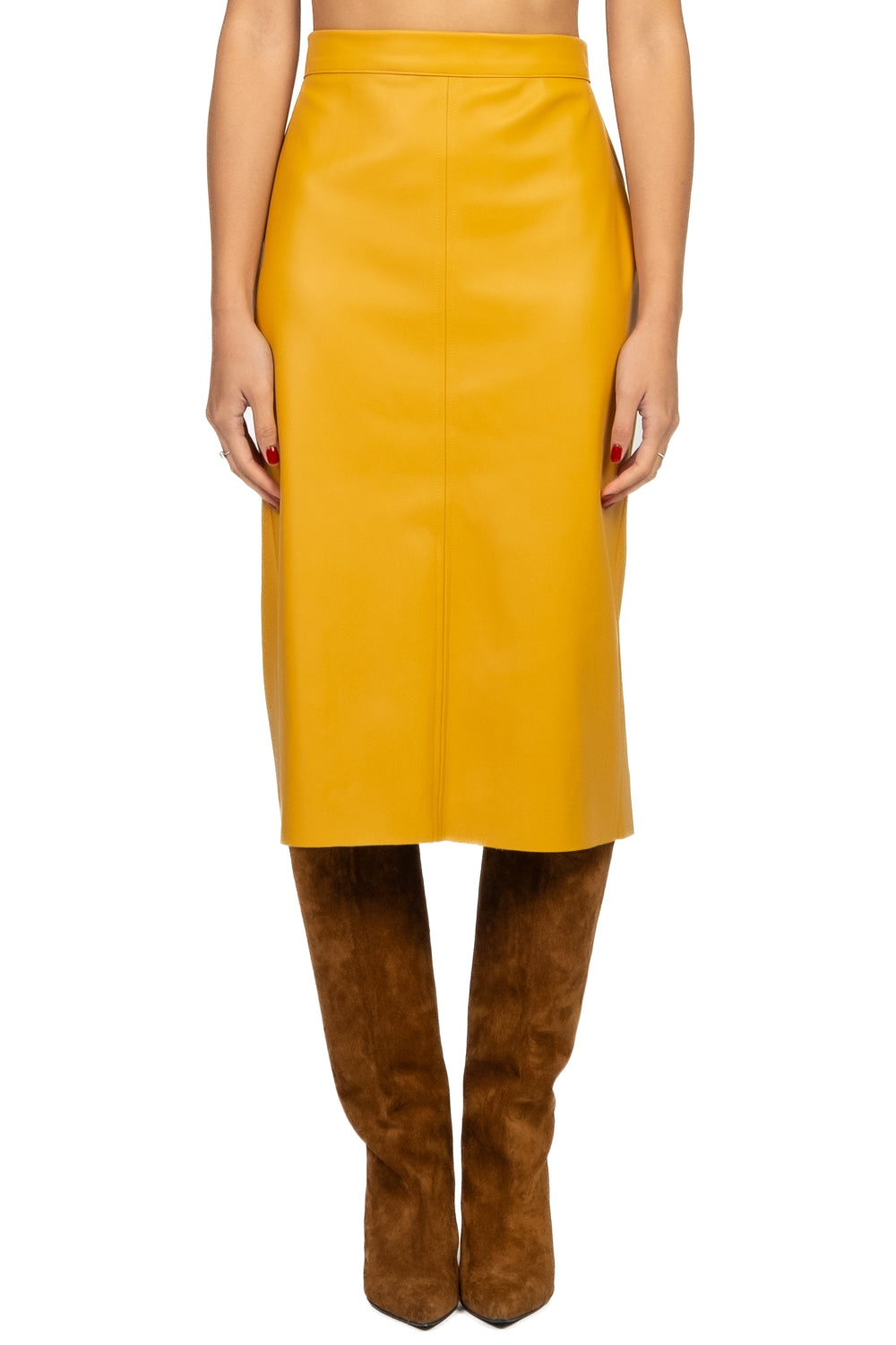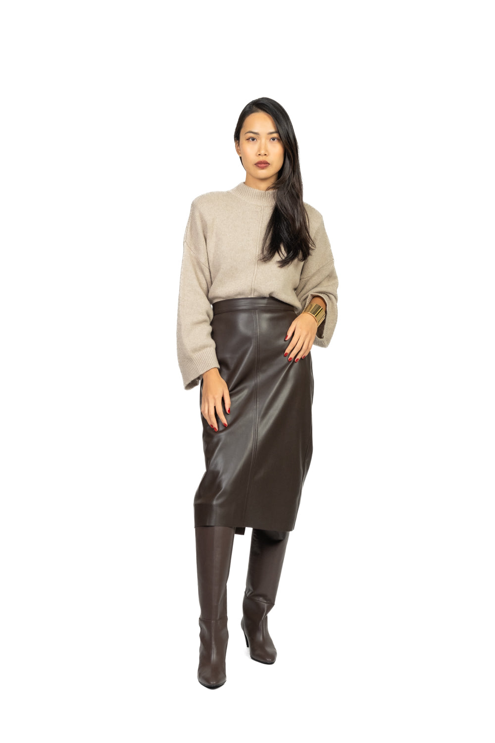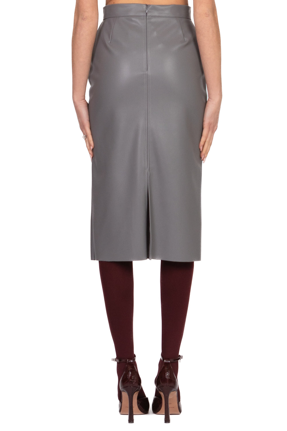 • Gonna longuette realizzata in ecopelle, con spacco posteriore per maggiore libertà di movimento. Chiusura lampo sul retro per una vestibilità sicura e pulita. Ideale per look contemporanei e sofisticati, perfetta da abbinare a camicie o top eleganti.
