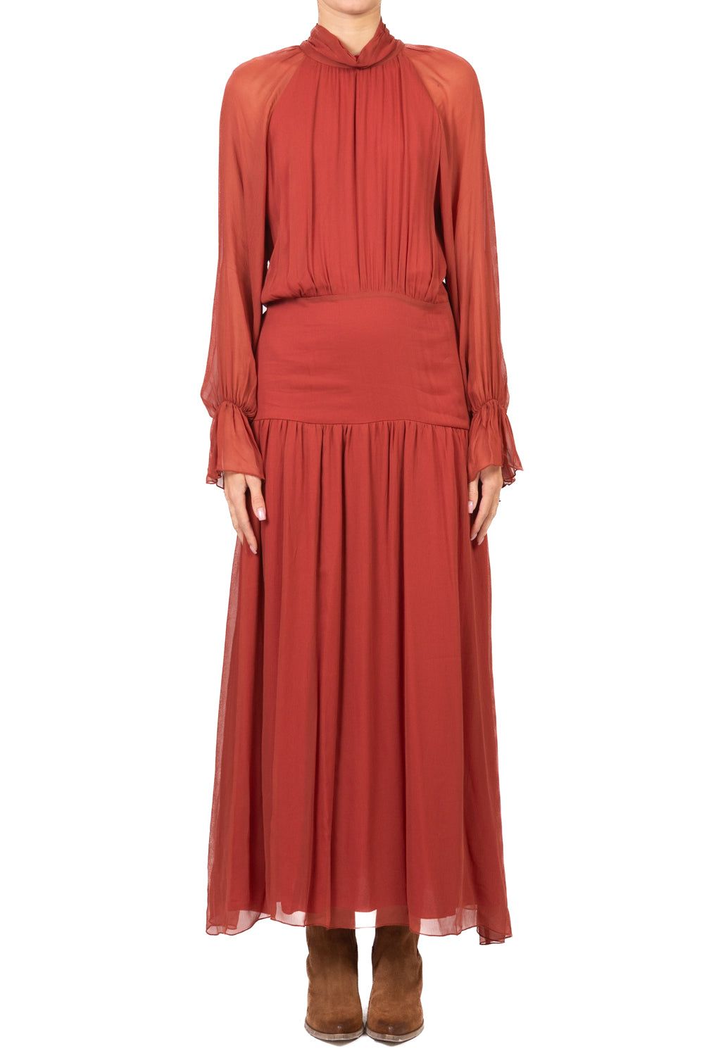 Abito lungo elegante con maniche palloncino semitrasparenti e rouches sul fondo per un effetto femminile e romantico. Presenta sottoveste cucita per maggiore comfort e copertura, e chiusura posteriore con bottoncini e asola. Perfetto per occasioni speciali e look sofisticati.