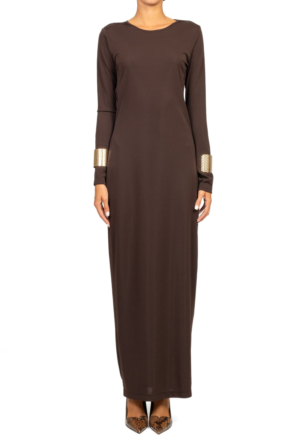 Un capo di grande stile, questo abito si distingue per lo scollo posteriore asimmetrico che dona un tocco moderno e originale. Il girocollo frontale bilancia l’effetto, creando un equilibrio perfetto tra eleganza e design contemporaneo. Completo di bracciali in dotazione, è la scelta ideale per occasioni speciali o serate chic.