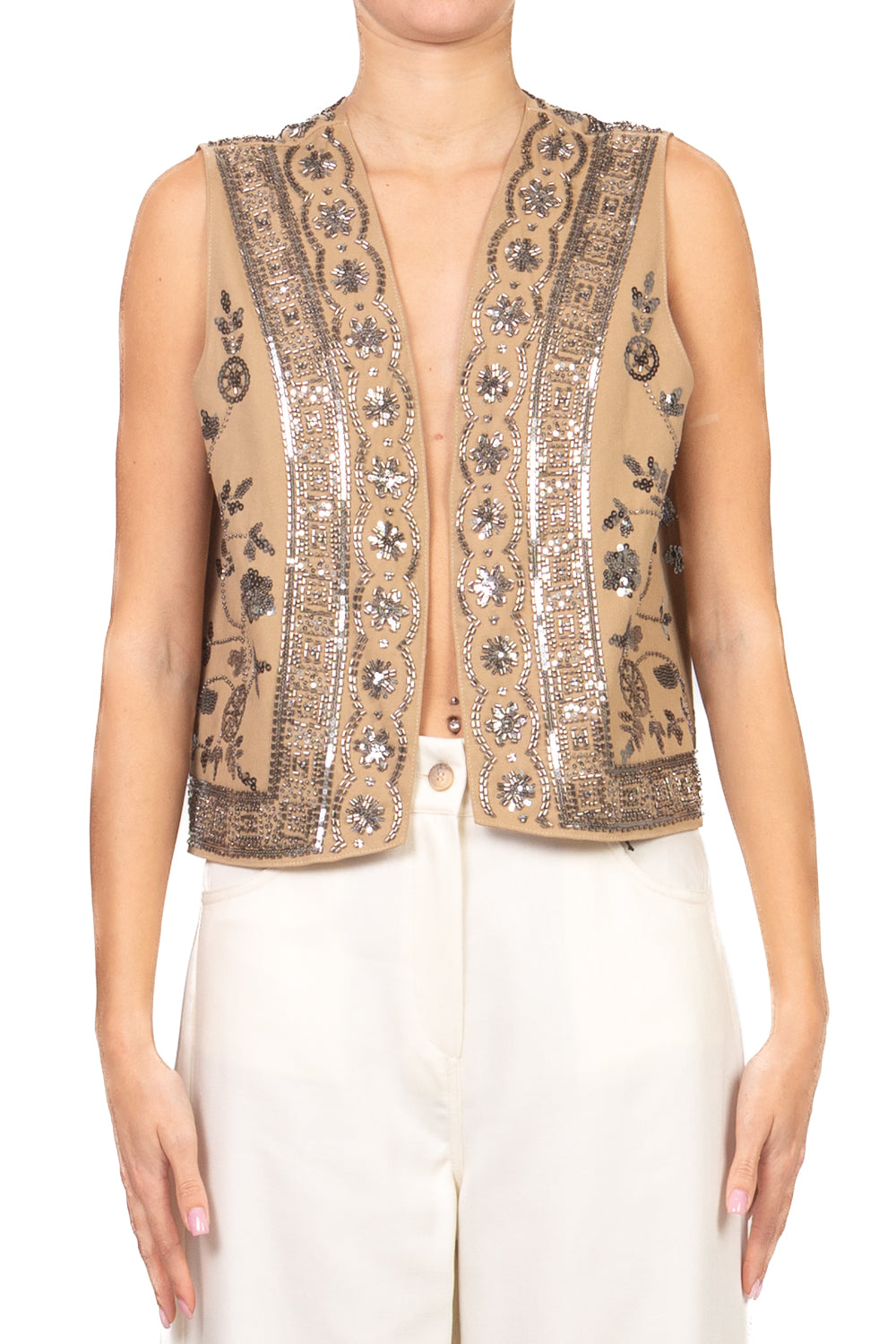 • Gilet corto aperto, decorato con raffinati ricami floreali e perline. Un dettaglio prezioso che aggiunge un tocco glamour e originale a ogni look.
