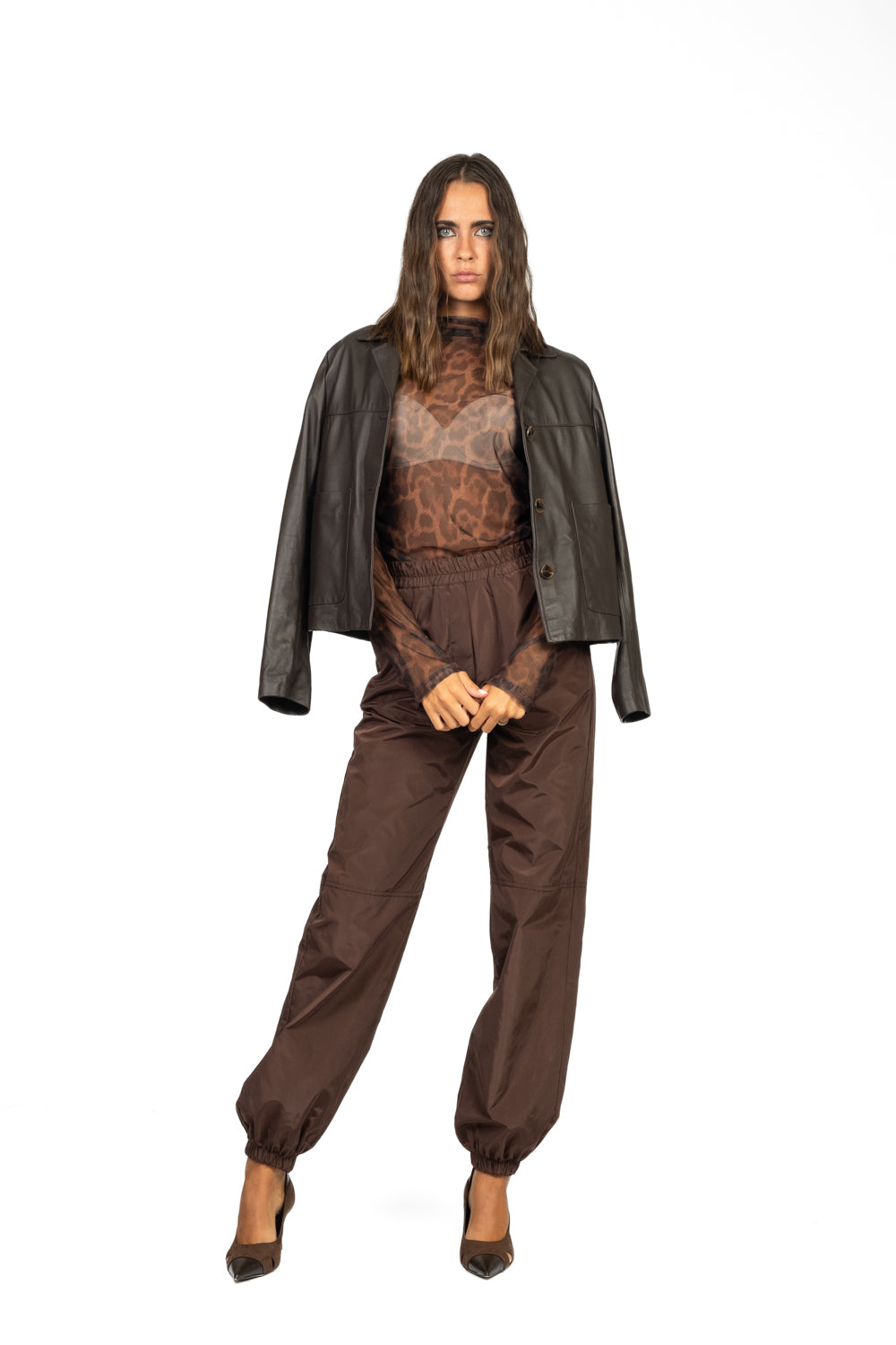 • Grintosa, sensuale e ultra femminile, questa maglia velata maculata è il capo perfetto per dare carattere ai tuoi look. Realizzata in un tessuto semi-trasparente leggero, avvolge la silhouette con delicatezza e movimento grazie al drappeggio strategico che crea un effetto elegante e slanciato. Il motivo animalier dona un tocco audace ma sofisticato, perfetto per outfit da sera o per un look da giorno dal forte impatto stilistico.