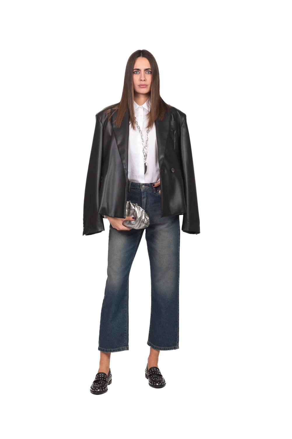 Jeans crop a gamba dritta realizzati in 100% cotone. Modello a cinque tasche con chiusura frontale tramite zip e bottone, caratterizzato da tela slavata sabbiata per un effetto vintage e contemporaneo.