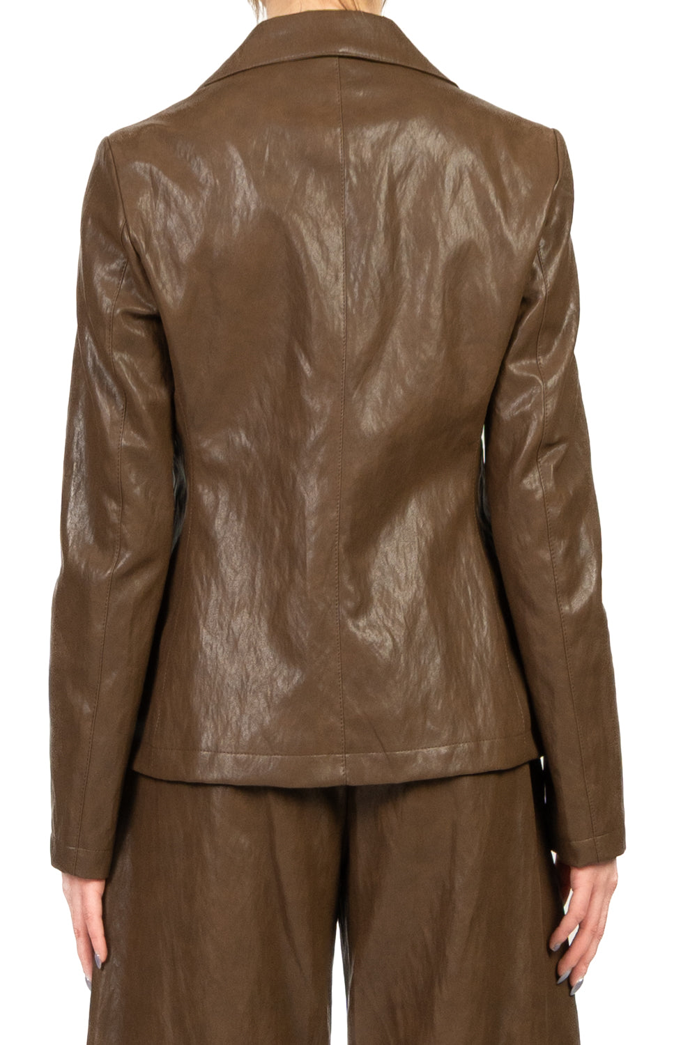 Giacca corta in ecopelle effetto stropicciato, abbinabile al pantalone barrel coordinato. Dal taglio moderno e minimal, è priva di tasche e si chiude con un solo bottone, mentre la fodera interna garantisce comfort e vestibilità, per un look urbano e contemporaneo completo.