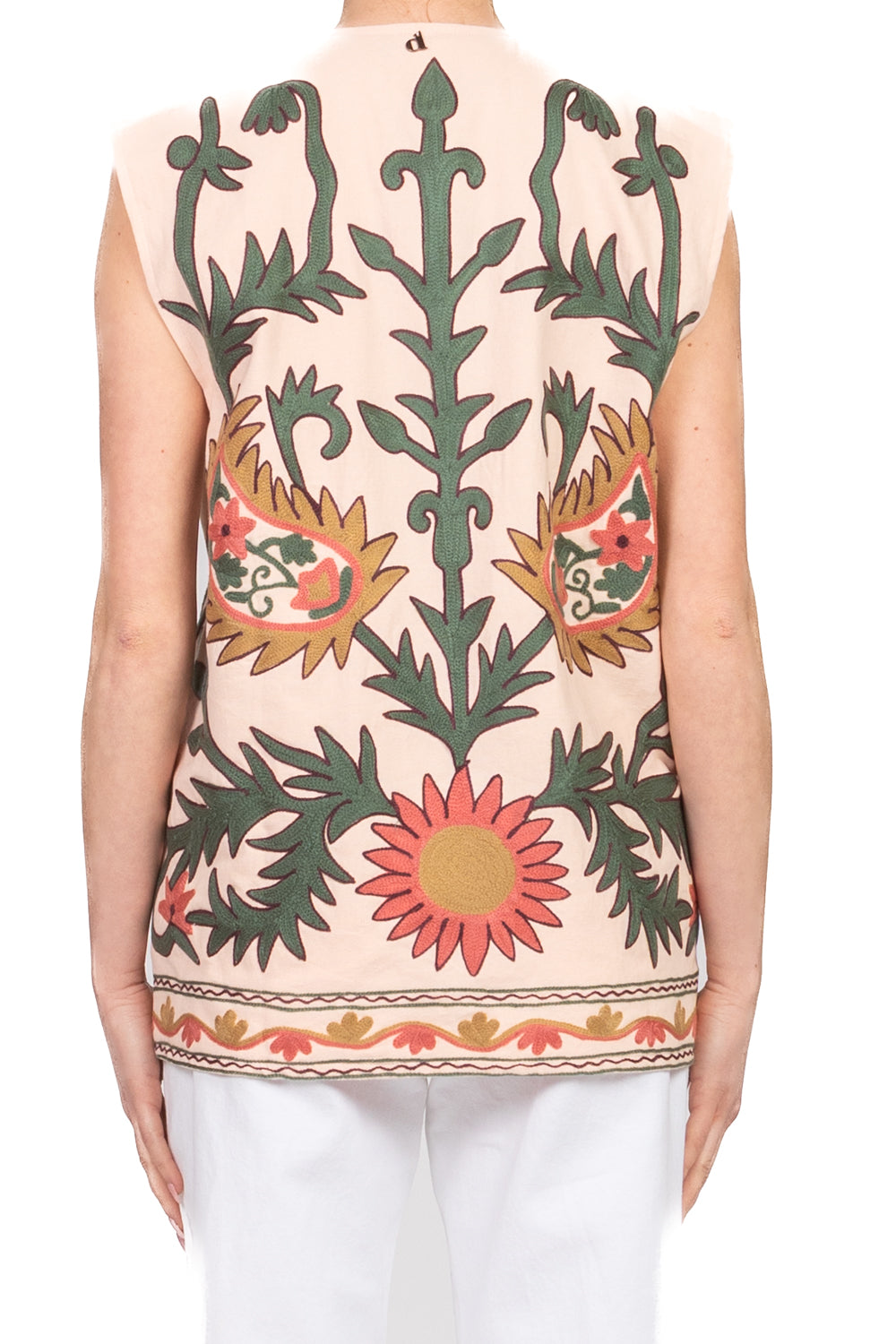 Gilet dal taglio over realizzato in tessuto ricamato, con linea leggermente sciancrata per valorizzare la silhouette. Interno in tessuto gessato a contrasto. Vestibilità morbida e strutturata, ideale per look sofisticati e di carattere.
