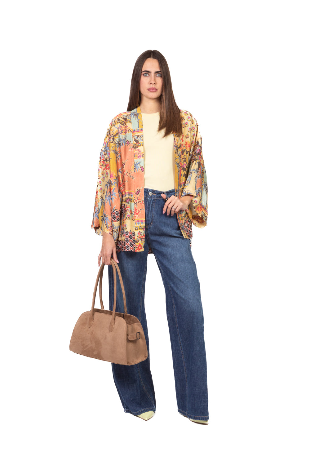 Kimono leggero e fluido in satin con fantasia elegante, aperto sul davanti e dotato di tasche frontali. Perfetto per look sofisticati e femminili, da giorno o da sera.