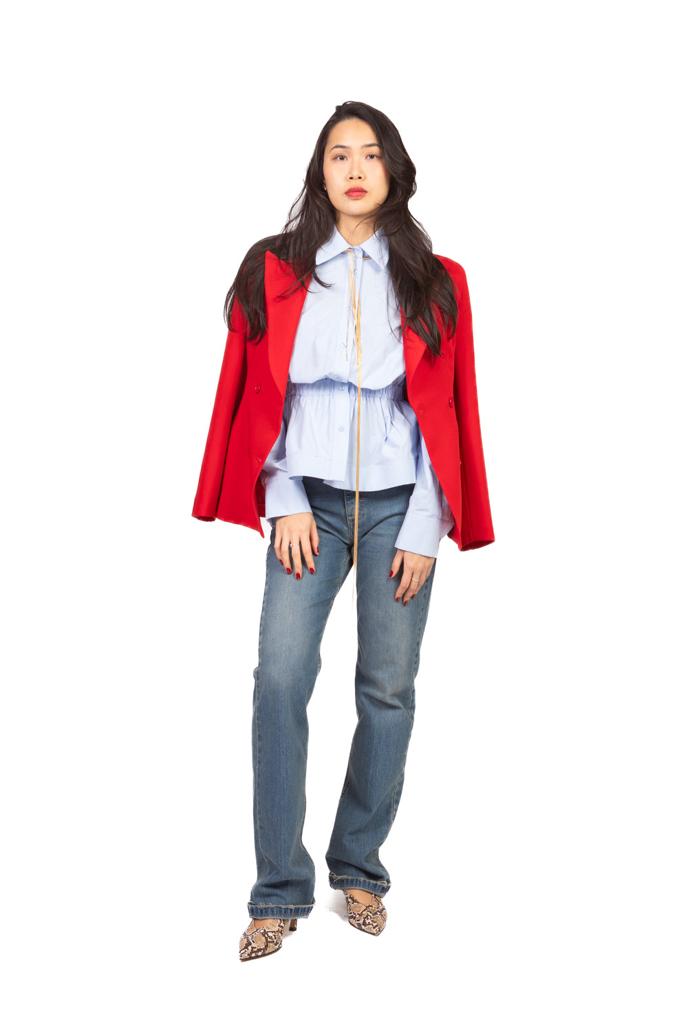 Camicia realizzata in cotone leggero e traspirante. Design con arricciatura in vita e inserto elastico che valorizza la silhouette e definisce il punto vita. Linea femminile, vestibilità confortevole, ideale per look quotidiani curati e versatili.