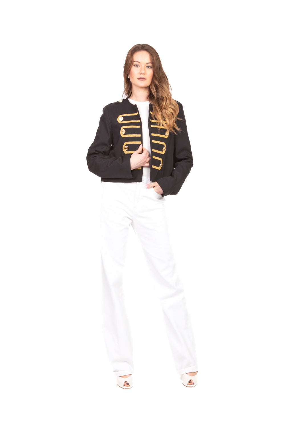 Elegante e dal taglio moderno, questa giacca ispirata allo stile Napoleone presenta un design aperto senza chiusura, perfetta per creare look sofisticati e contemporanei da abbinare a outfit casual o formali.