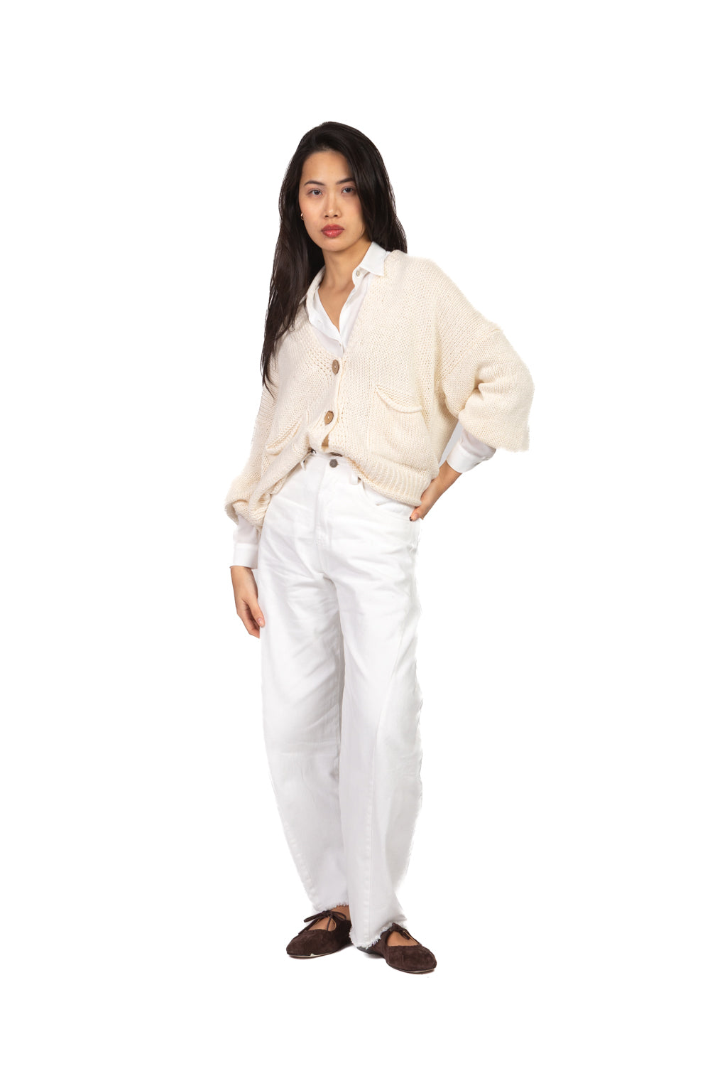 Cardigan over in fettuccia di cotone, con maniche a palloncino per un tocco femminile e morbido. Chiusura con 3 bottoni e tasche frontali, perfetto per completare ogni outfit con stile e comfort.