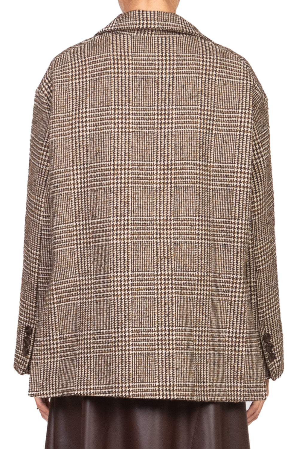 Un capo moderno e sofisticato, caratterizzato da motivo check, vestibilità over e spille decorative sparse sul lato sinistro. Completamente foderata all’interno, con spalline leggermente imbottite e spacchetti posteriori, è perfetta per look contemporanei e ricercati.
