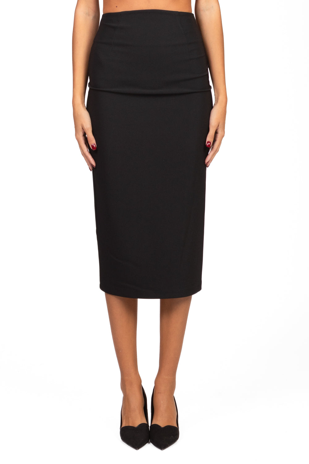 Questa gonna tubino dal taglio classico è caratterizzata da uno spacco posteriore che aggiunge un tocco di femminilità e facilita il movimento. La chiusura con zip sul retro garantisce una vestibilità perfetta, rendendola ideale per look formali e professionali con un tocco raffinato.