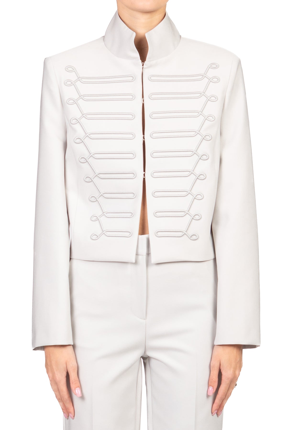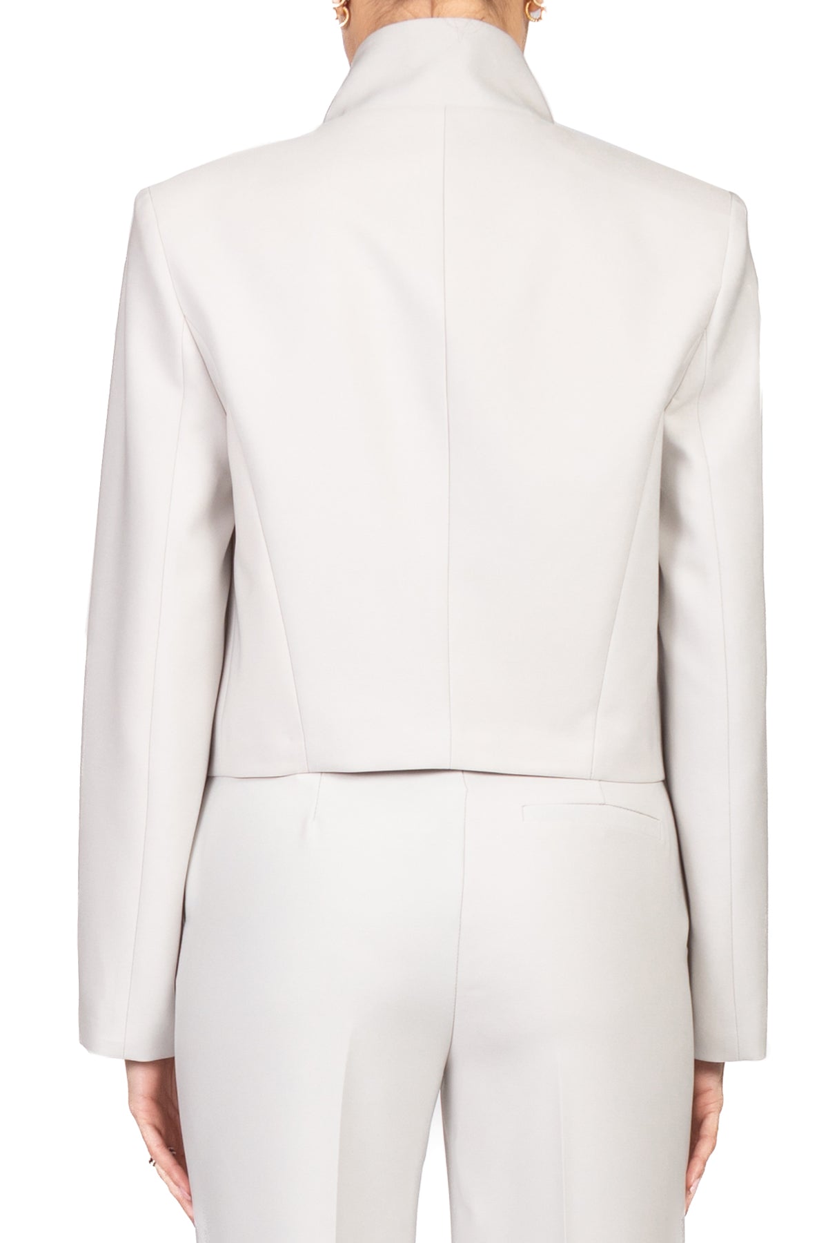 • Giacca dallo stile sofisticato in satin, con chiusura frontale a gancetti nascosti e colletto alto per un dettaglio elegante. Spalline leggermente imbottite e interno completamente foderato assicurano comfort e struttura. Perfetta per look formali e outfit di carattere.
