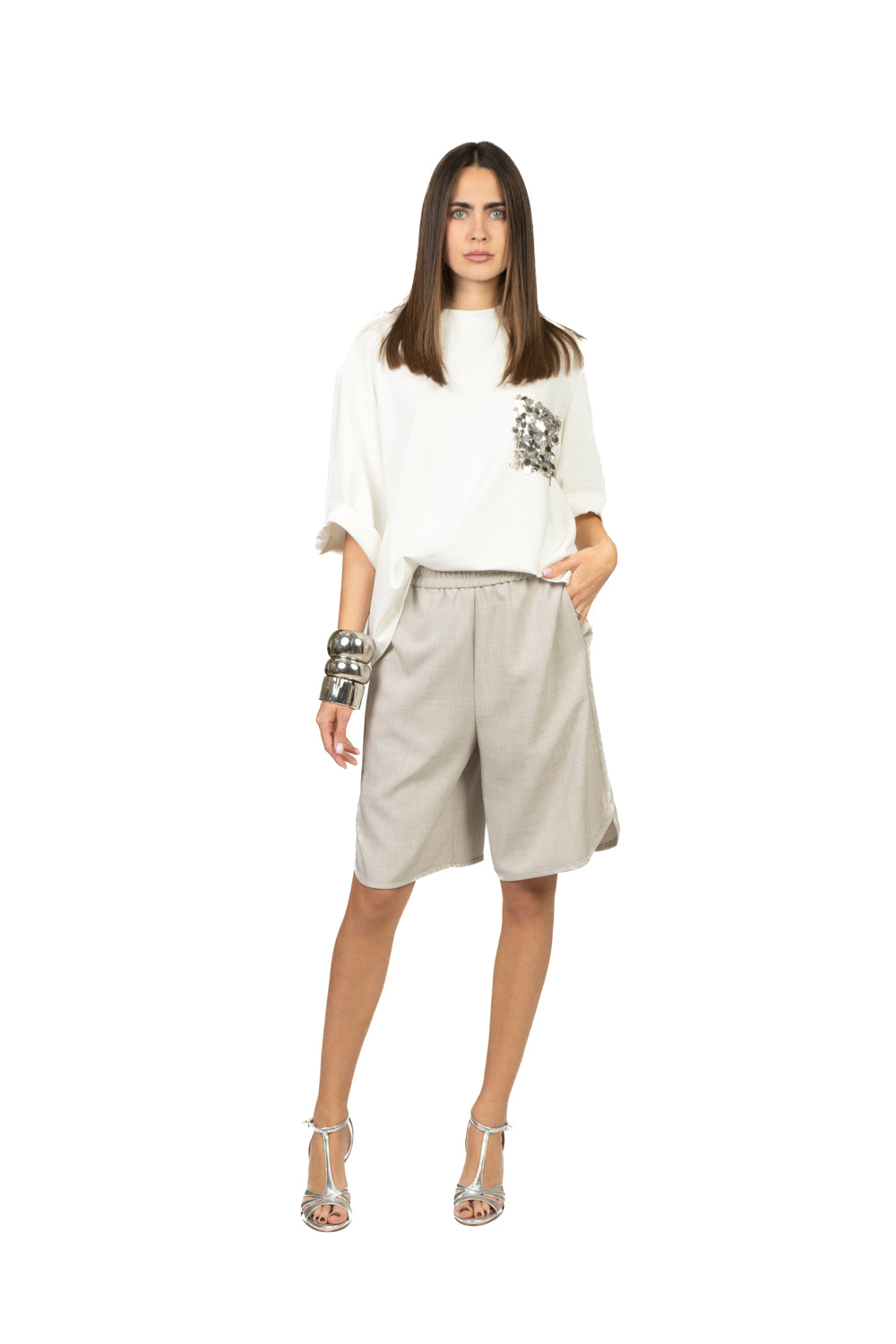 • Bermuda con elastico in vita, tasche a filo e spacchetti laterali, pensati per il massimo comfort senza rinunciare allo stile. Pratici e versatili, sono perfetti per creare look freschi e curati in pochi gesti.