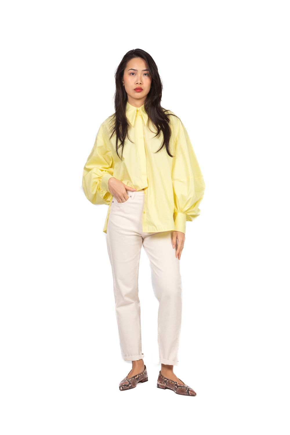 Camicia con maniche a palloncino, colletto allungato e chiusura con bottoni a scomparsa. Dotata di spacchi laterali per maggiore libertà di movimento. Linea femminile, vestibilità regolare e design elegante e moderno.