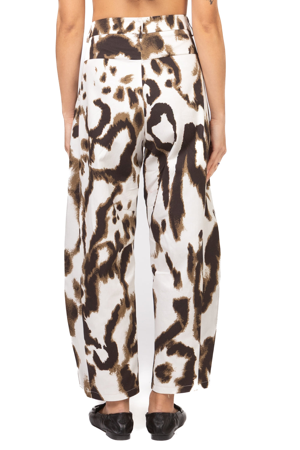 Pantalone barrel con motivo pezzato, chiusura a lampo e bottone e tasche laterali. vestibilità regolare e tessuto strutturato simil denim per un look contemporaneo.