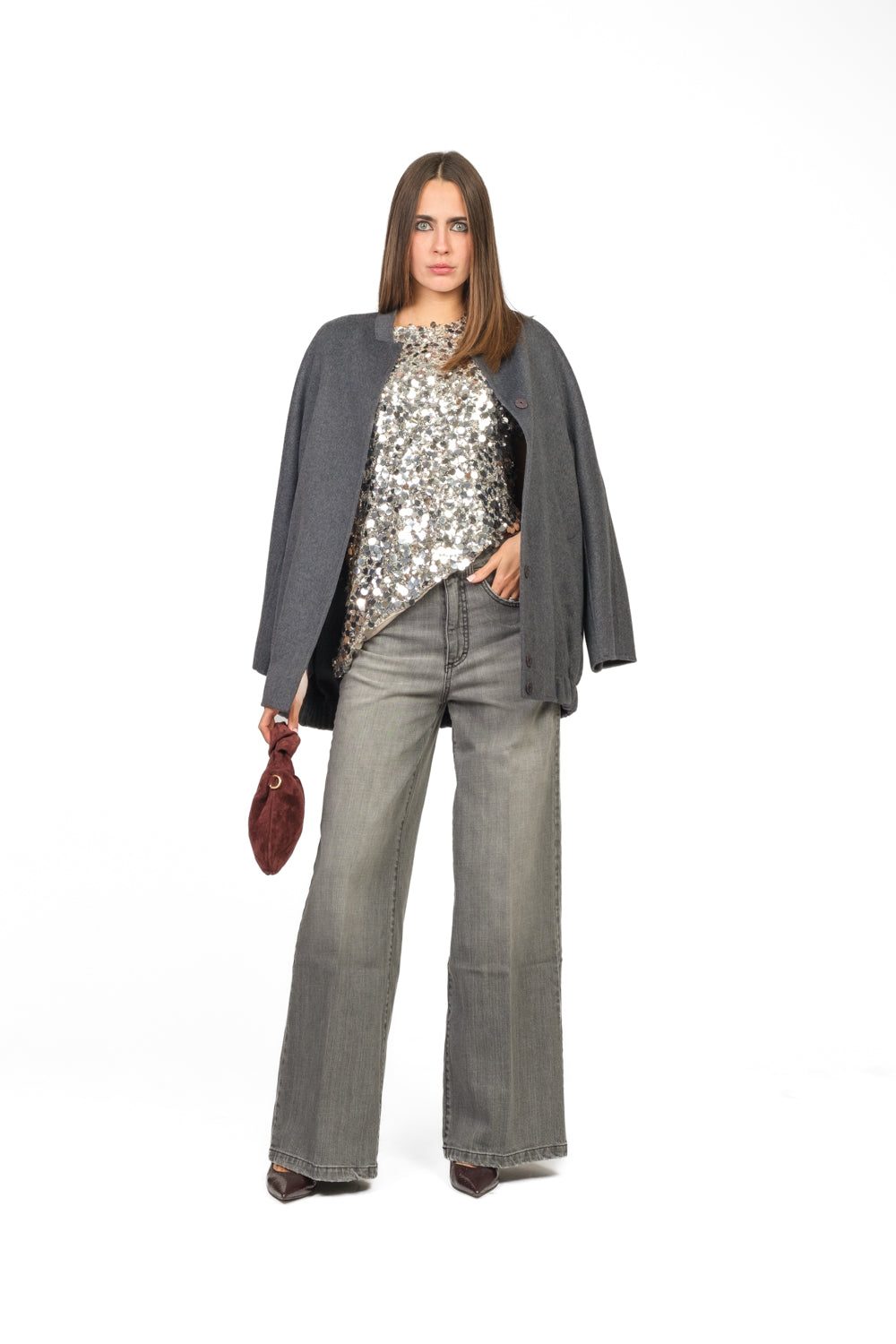 T-shirt asimmetrica decorata con paillettes, dotata di spalline leggermente imbottite e chiusura a bottoncino sul retro. Vestibilità moderna e femminile, ideale per look eleganti e di carattere.
