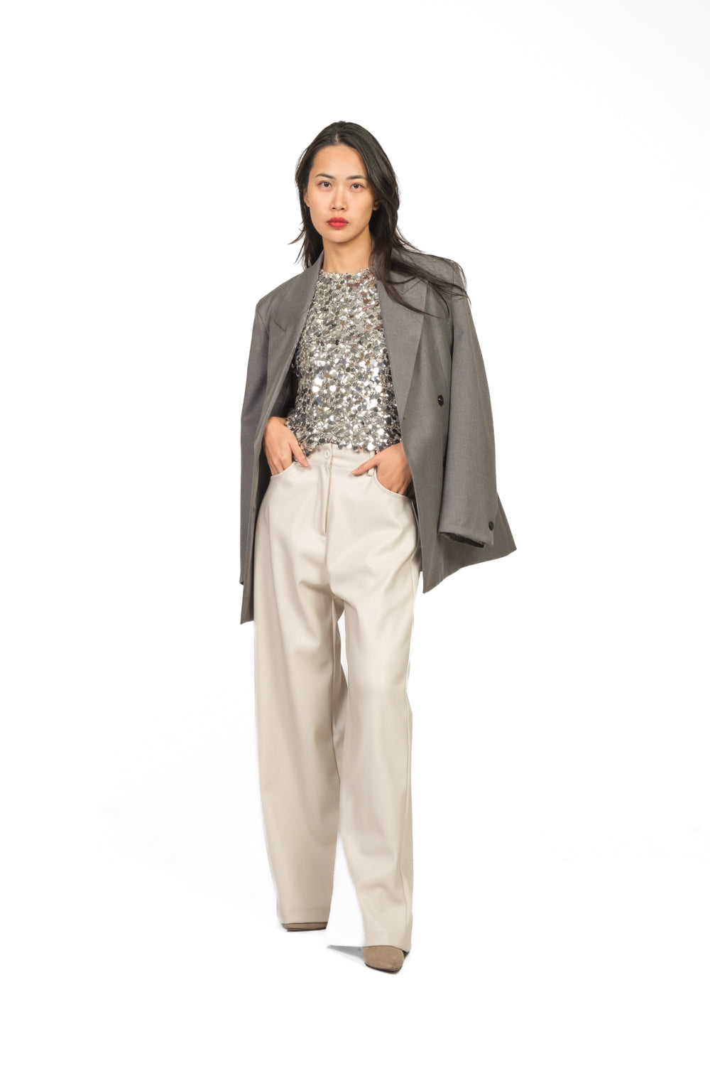 T-shirt a manica corta decorata con paillettes, con chiusura a bottoncino sul retro. Vestibilità morbida e stile luminoso, perfetta per look eleganti e di tendenza.