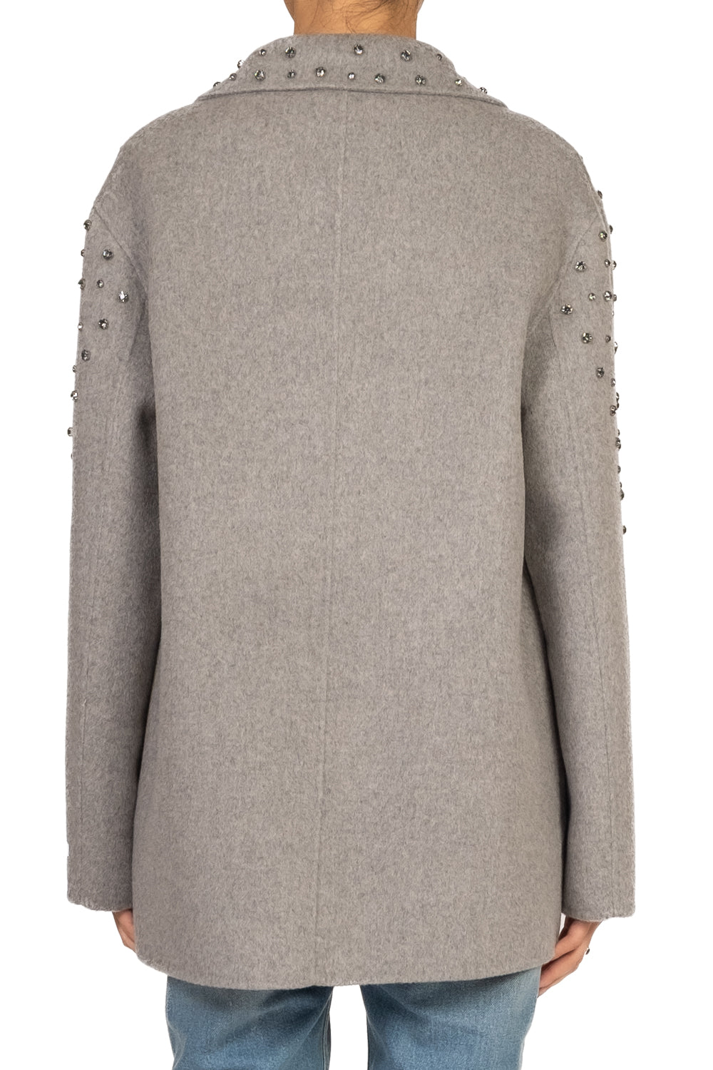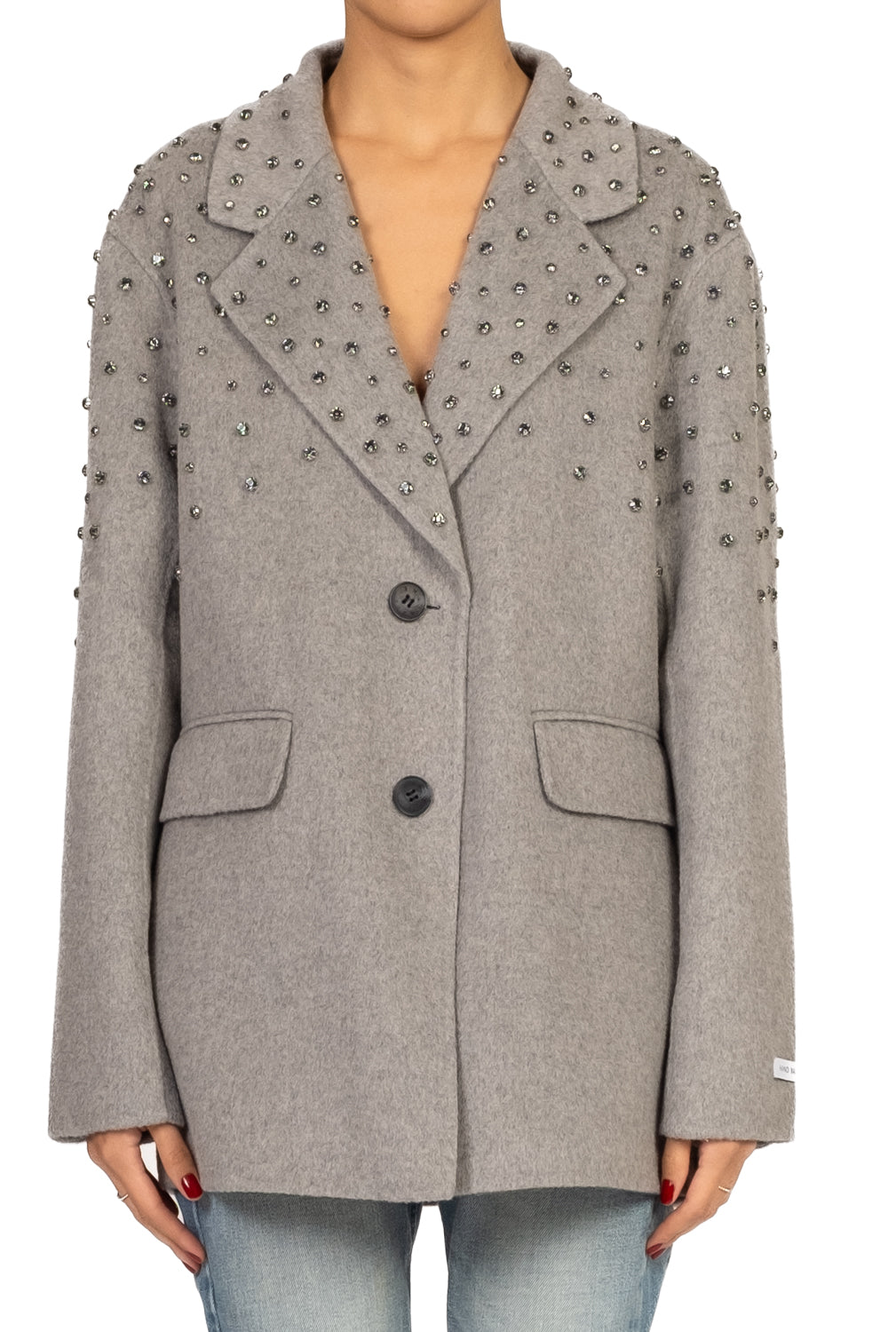 • Giacca over  in lana realizzata a mano, con applicazioni decorative sulla parte superiore che aggiungono un tocco ricercato. Chiusura a due bottoni, tasche frontali e design pulito per uno stile elegante e sofisticato.
