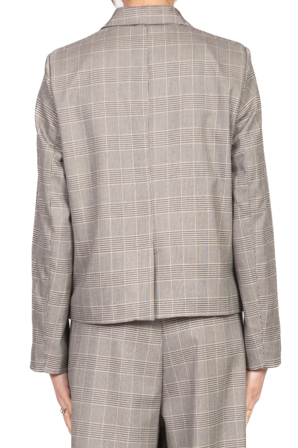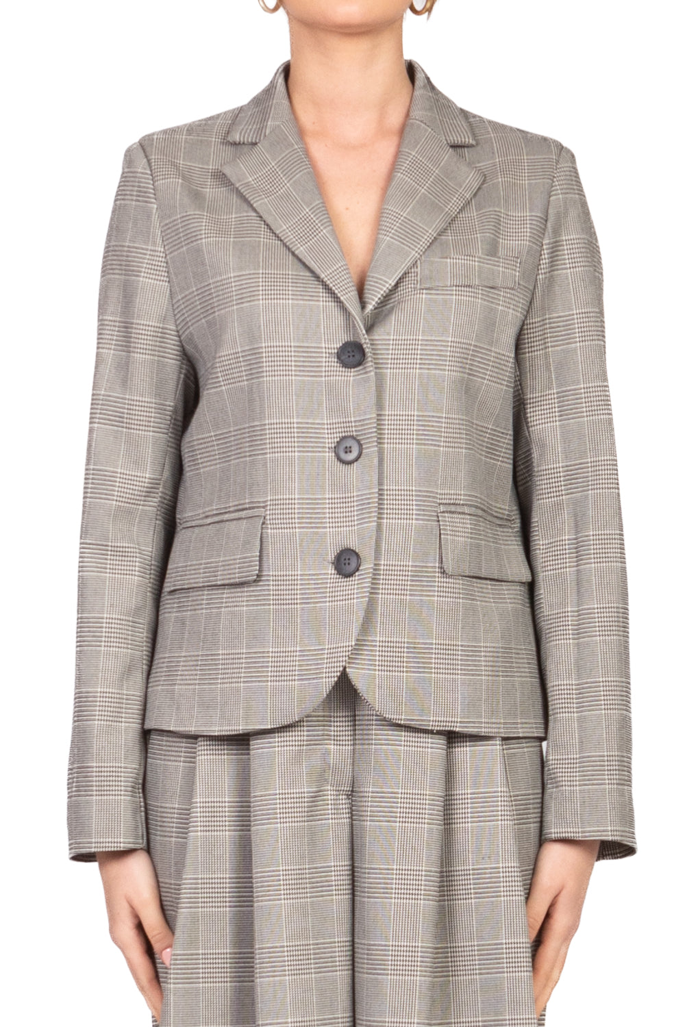 Un capo elegante e strutturato, caratterizzato da motivo principe di Galles, tre bottoni, taschino e tasche frontali, spacchetto posteriore e spalline leggermente imbottite. Completamente foderata all’interno, è perfetta per look raffinati e contemporanei.