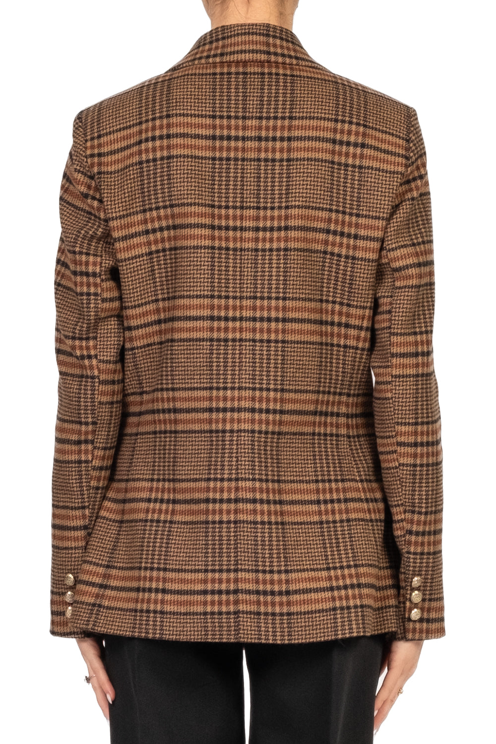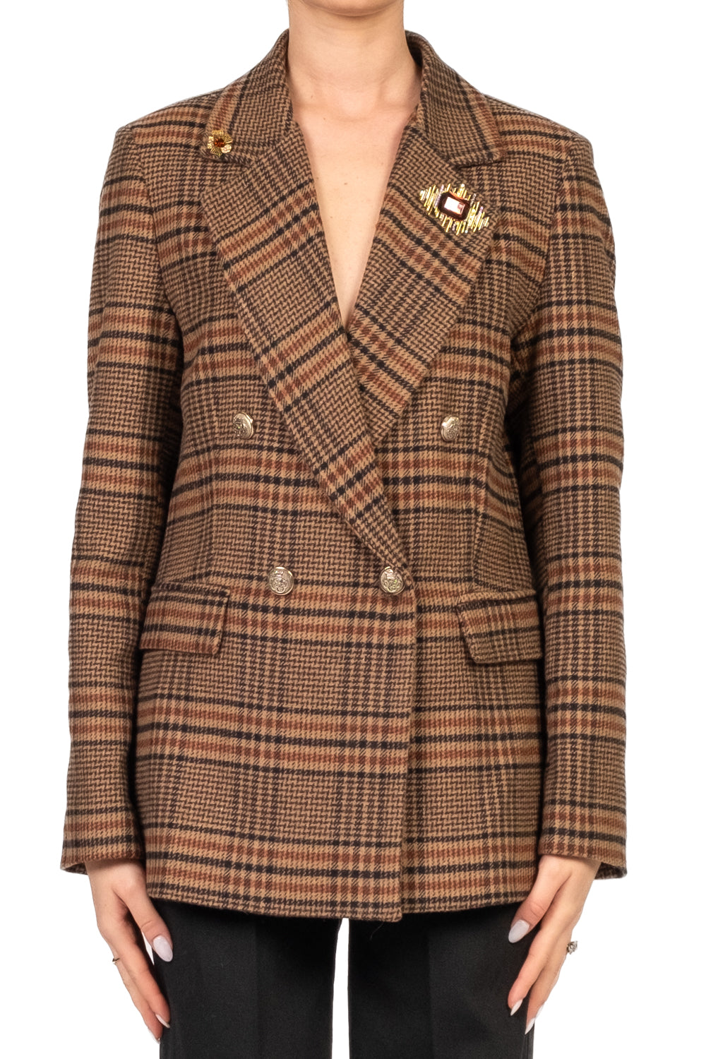 • Questa giacca doppiopetto in fantasia check unisce stile classico e dettagli raffinati. I bottoni dorati e le spille applicate sul bavero aggiungono un tocco di lusso e personalità, mentre le tasche frontali e la fodera interna garantiscono comfort e funzionalità. Perfetta per un look sofisticato e contemporaneo.