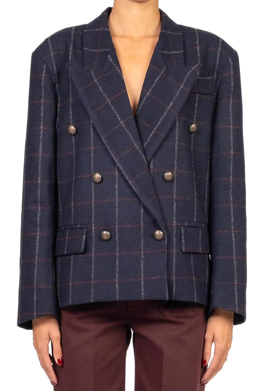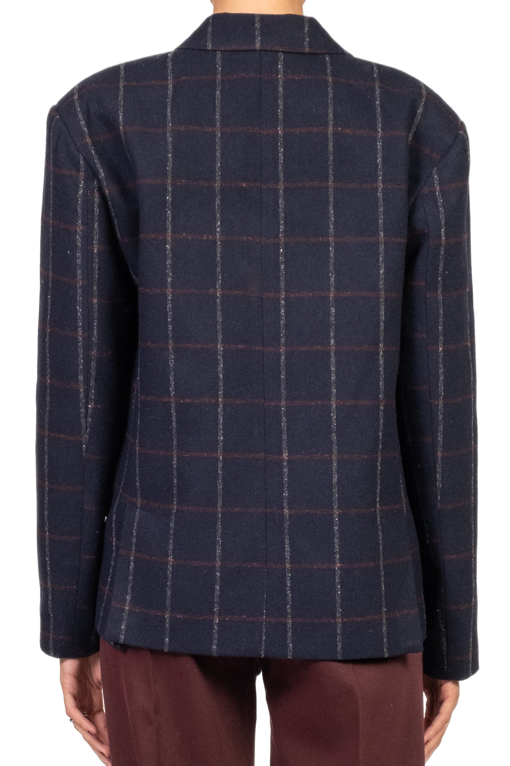 • Giacca doppiopetto con fantasia a quadri e spalline leggermente imbottite per una linea strutturata. Completamente foderata all’interno, è dotata di tasche frontali, taschino decorativo e due spacchi posteriori che garantiscono comfort e libertà di movimento. Perfetta per un look sofisticato e contemporaneo.