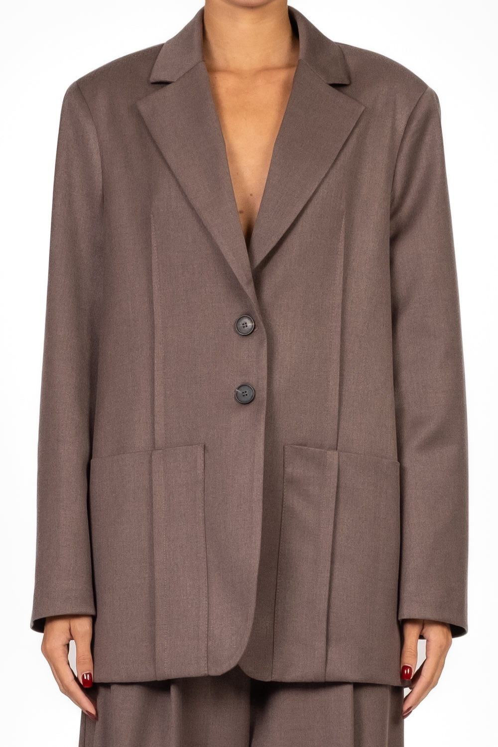 Questa giacca lunga, foderata all’interno per un comfort ottimale, si distingue per le spalline leggermente imbottite che donano struttura e stile alla silhouette. La chiusura a due bottoni e le tasche frontali uniscono funzionalità ed eleganza, mentre le cuciture frontali in rilievo aggiungono un dettaglio raffinato e moderno. Perfetta per look formali o casual chic.